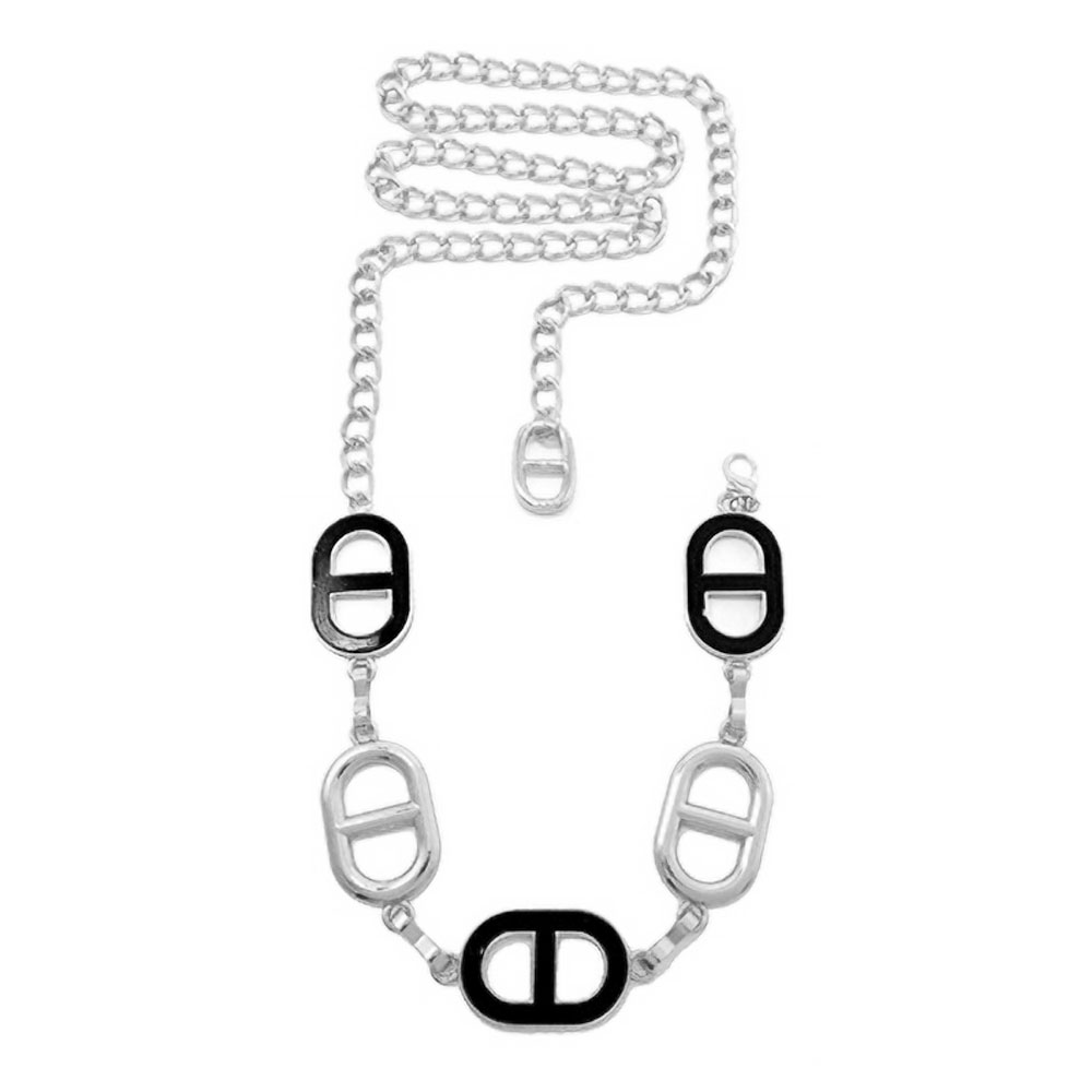 • Complete your ensemble with this circular link waist belt featuring a sequence of bold interlocking rings. Its sleek, structured design adds a touch of elegance and versatility, perfect for enhancing both casual looks and sophisticated evening styles.