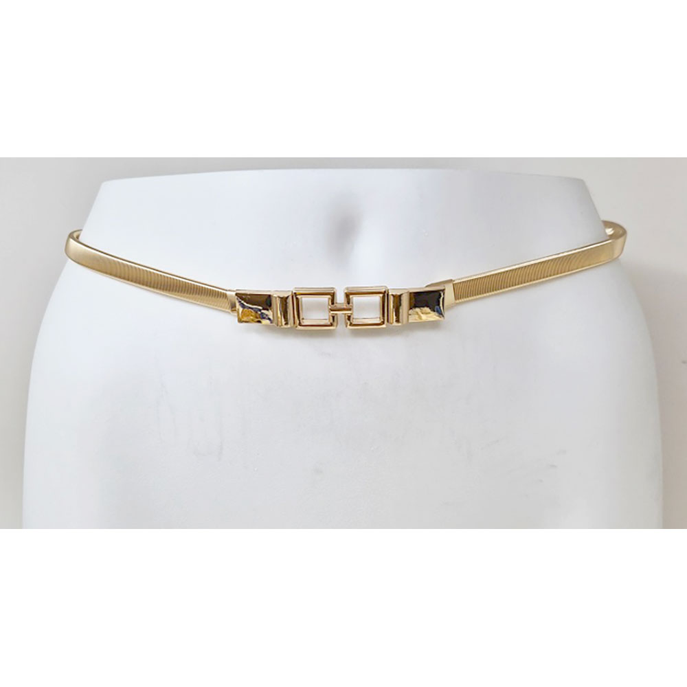 Details • Size : 0.6" H, 28" L • Stretchable • Hook Closure • Complete your look with this sleek waist belt featuring a slim strap and polished linked centerpiece. Designed to add a modern and sophisticated touch, it pairs beautifully with dresses, gowns, or formal outfits, making it the perfect accessory for weddings, parties, and evening events. • Lead and Nickel Compliant