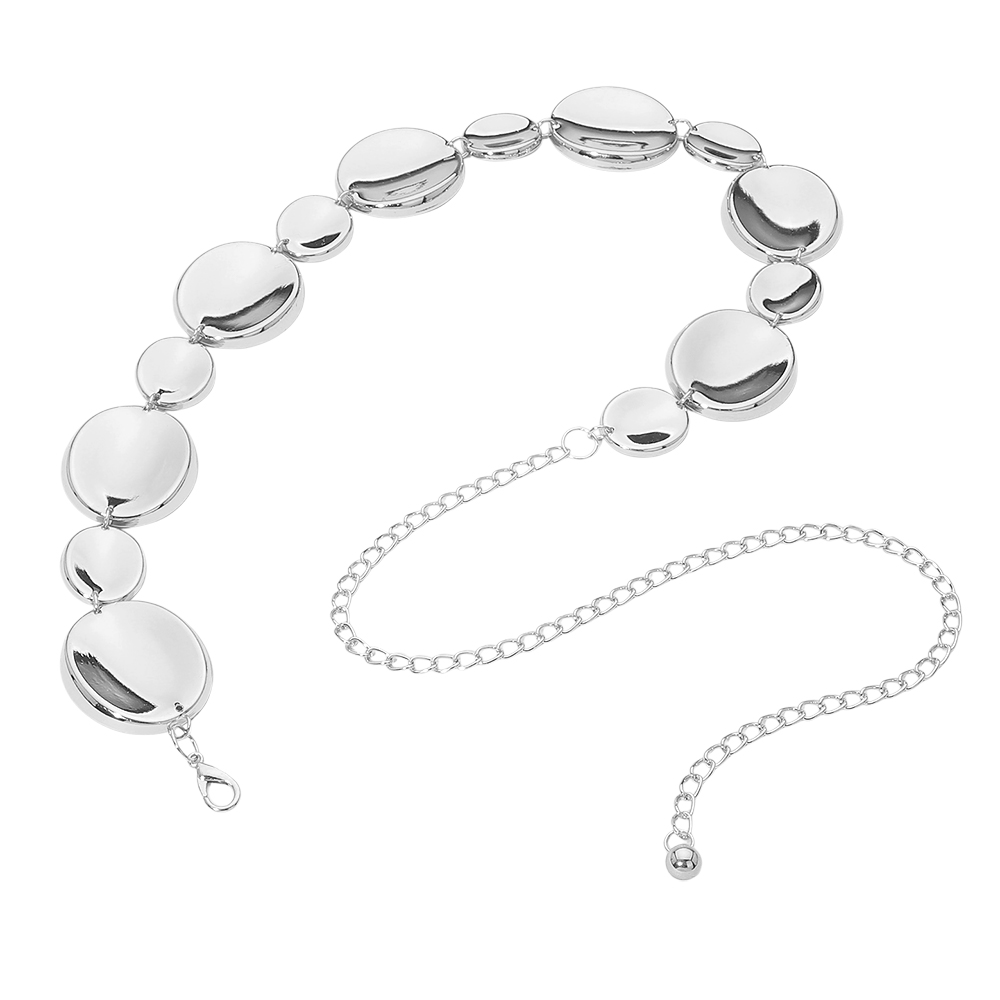 • Elevate any outfit with this sleek disc chain waist belt designed to define the silhouette with modern shine. Featuring smooth linked discs that sit comfortably at the waist, it adds refined statement appeal to dresses, jumpsuits, and evening looks, perfect for styling, layering, and standout occasions.