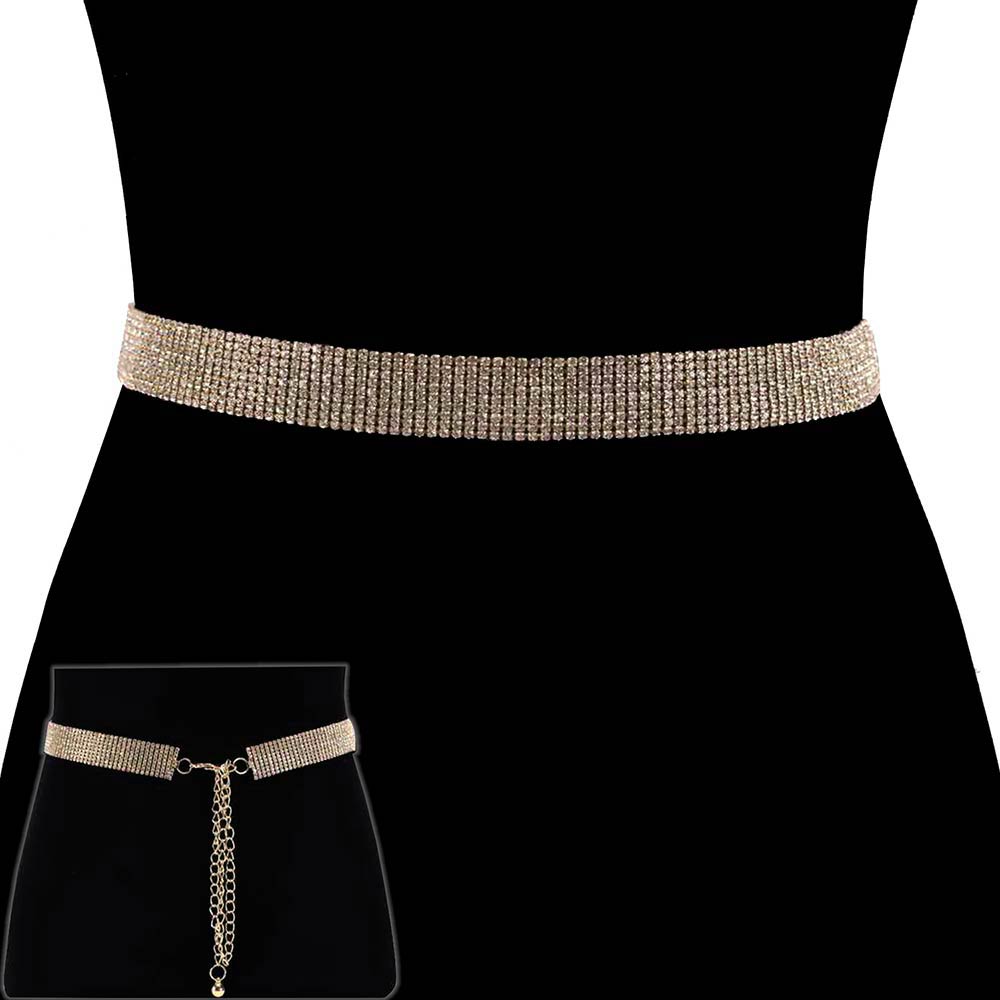 • This slim waist chain belt features rows of shimmering rhinestones with an adjustable chain back for a sleek, contoured fit. Designed to define the waist with subtle sparkle, it pairs effortlessly with dresses, jumpsuits, and evening looks, making it a versatile statement accessory for special occasions and elevated everyday styling.