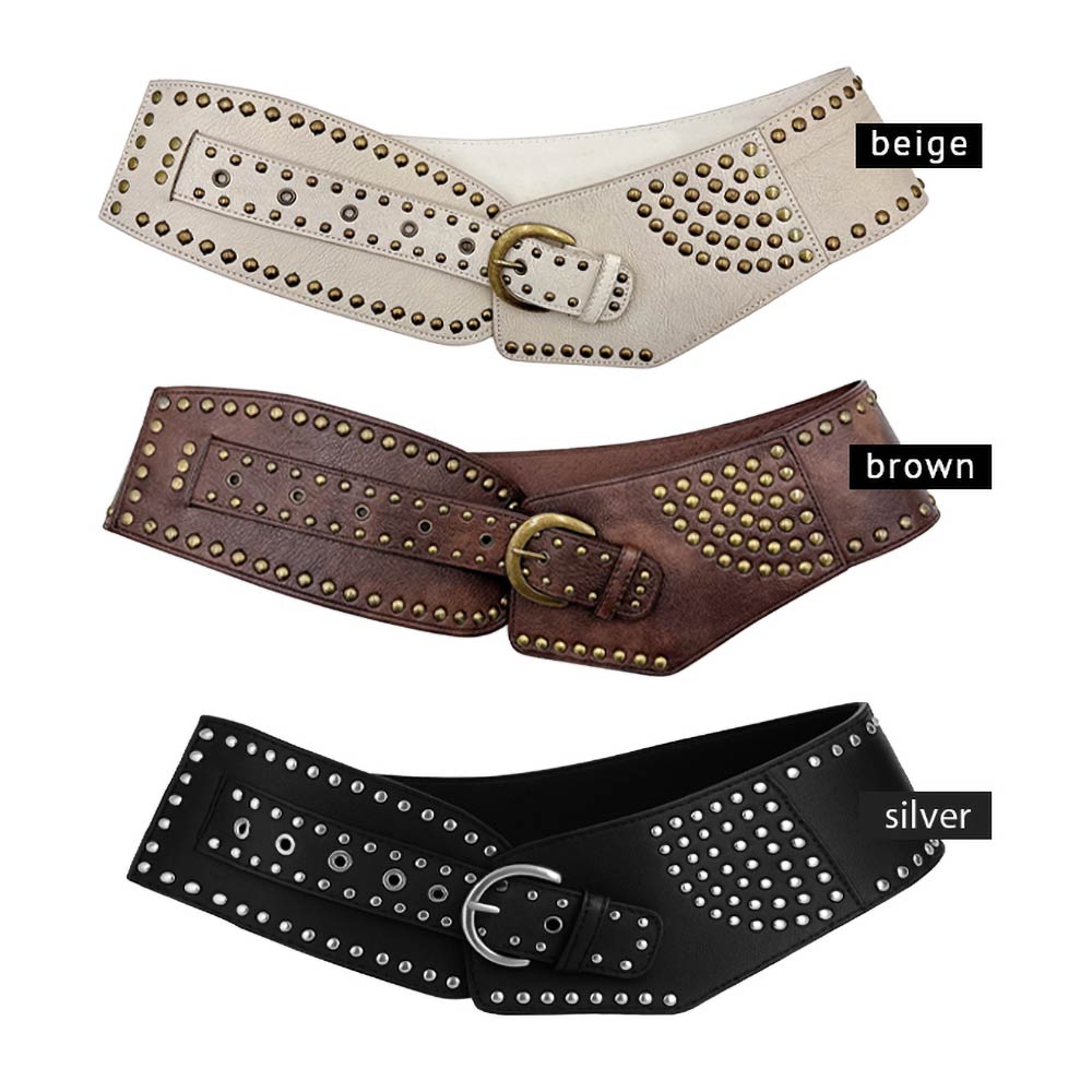 Details • Size : 3.7" H • Adjustable 40" L • Material : 100% Polyester • This wide studded fashion belt features a bold statement buckle that instantly elevates casual and dressy outfits. Designed to define the waist and add edge to denim, skirts, and layered looks, it’s ideal for boutique styling, trend-forward collections, and everyday fashion statements.