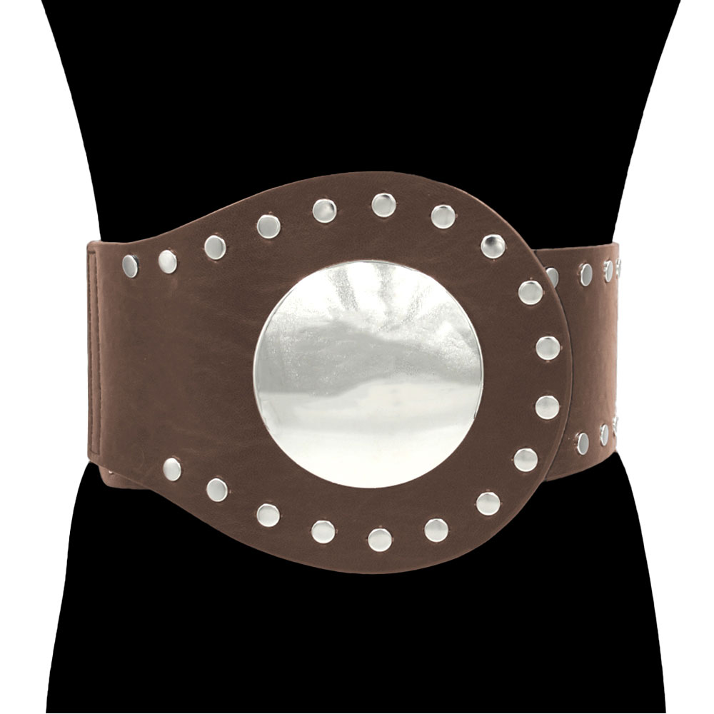 • This studded wide statement waist belt features a bold circular buckle with metallic accents that command attention. Designed to accentuate the waist with a contemporary edge, it adds a confident, high-fashion finish to dresses or tunics. Perfect for a chic and standout look.