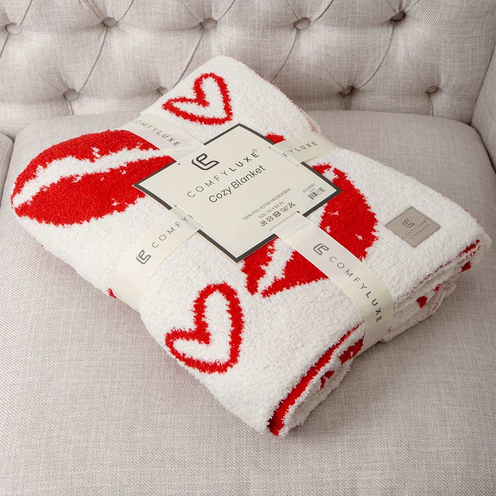 • Playful lips and heart pattern throw blanket designed for cozy lounging and stylish home dĂ©cor. Ideal for sofas, beds, or chairs, it adds a fun, romantic accent while providing everyday comfort, making it perfect for gifting, seasonal dĂ©cor, or casual relaxation.