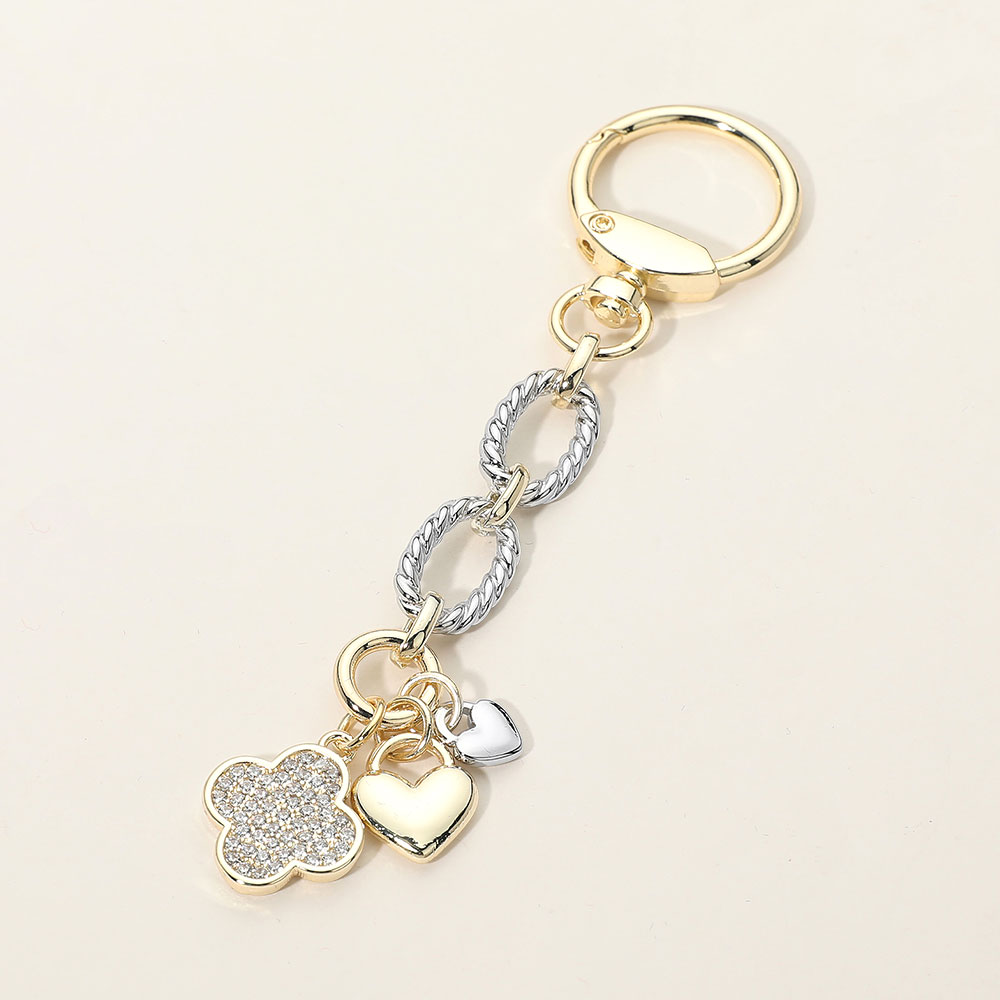 Details • Size : 5" L, 1" X 3.3" • This multi charm keychain features heart and quatrefoil motifs accented with crystal-style details and linked chain elements for a playful yet polished look. Designed to add charm and shine to keys or bags, it’s ideal for boutiques seeking giftable accessories that blend personality, sparkle, and everyday functionality. • CZ Cubic Zirconia • Gold Dipped