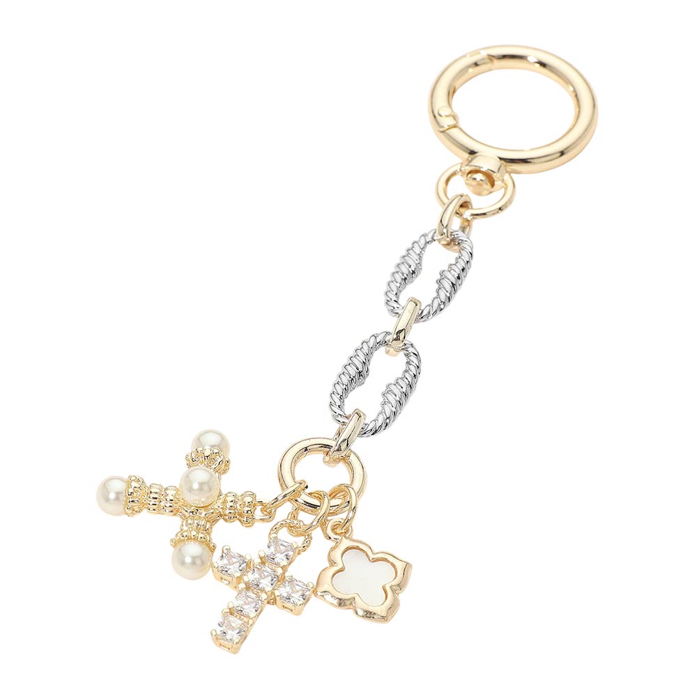 Details • Size : 5" L, 1" X 3.6" • This elegant charm chain keychain features a sparkling cross, a delicate clover accent, and refined bead details arranged on a stylish linked chain. Designed to elevate keys, handbags, or accessories, it adds a meaningful yet decorative touch to everyday essentials. A versatile accessory ideal for gifting, boutique collections, or seasonal assortments, combining timeless symbolism with polished charm appeal. • CZ Cubic Zirconia • Gold Dipped