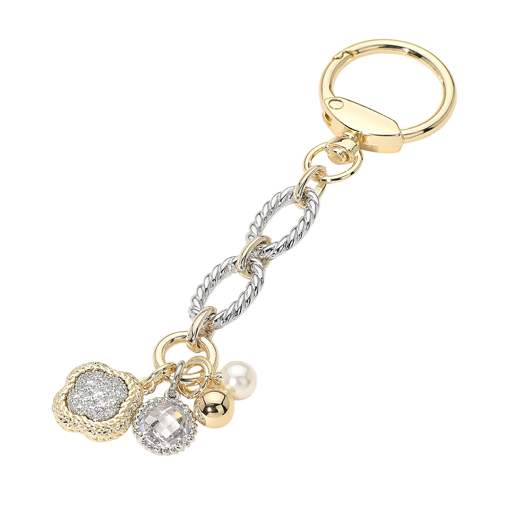 Details • Size : 5" L, 1" X 1.5" • Elegant multi charm keychain featuring a heart accent, textured crystal detail, and mixed shape charms on a linked chain. Designed to elevate keys or bags with a refined decorative touch, this versatile accessory works beautifully as a thoughtful gift, boutique add-on, or everyday statement piece with timeless appeal. • CZ Cubic Zirconia • Gold Dipped