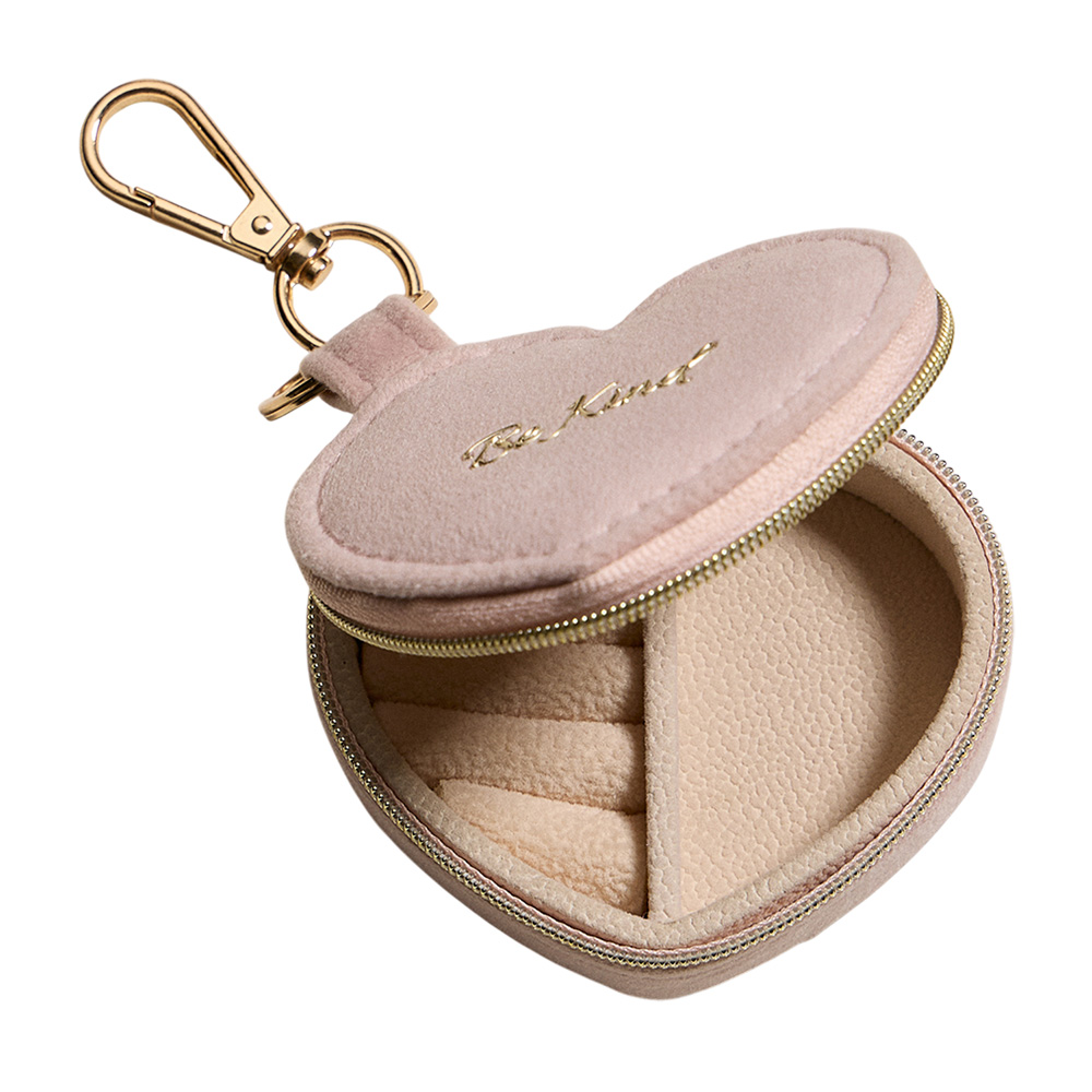 • Heart shaped travel jewelry case keychain featuring a zipper closure, soft interior with ring slots and compartment for small accessories. Compact and portable design makes it ideal for keeping jewelry secure at home or on the go, while the keychain clip adds convenience and style for daily use.