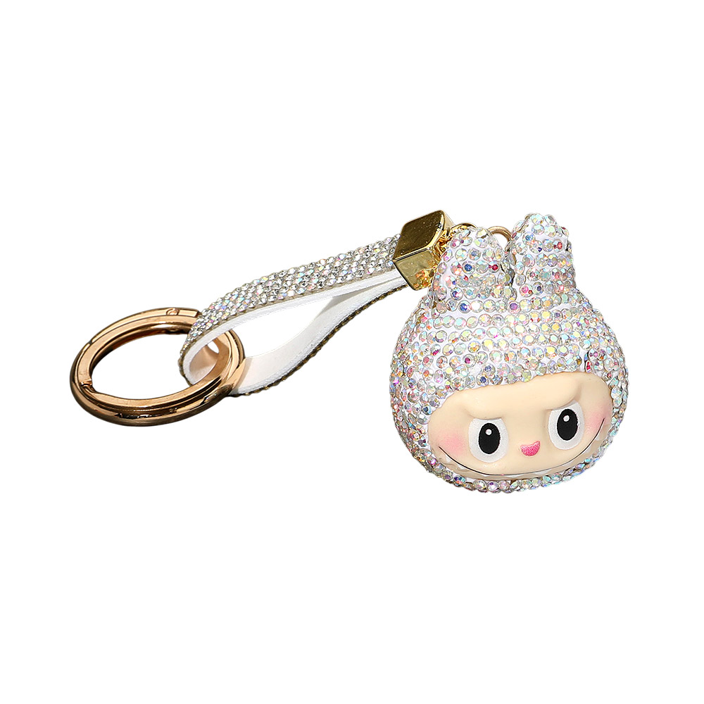 Details • Size : 1.7" X 2", 5.5" L • Adorable character keychain embellished with sparkling rhinestones and a matching wrist strap. Perfect for decorating handbags, backpacks, or car keys. A fun and stylish accessory that adds charm, shine, and personality to your everyday essentials or makes a delightful gift.