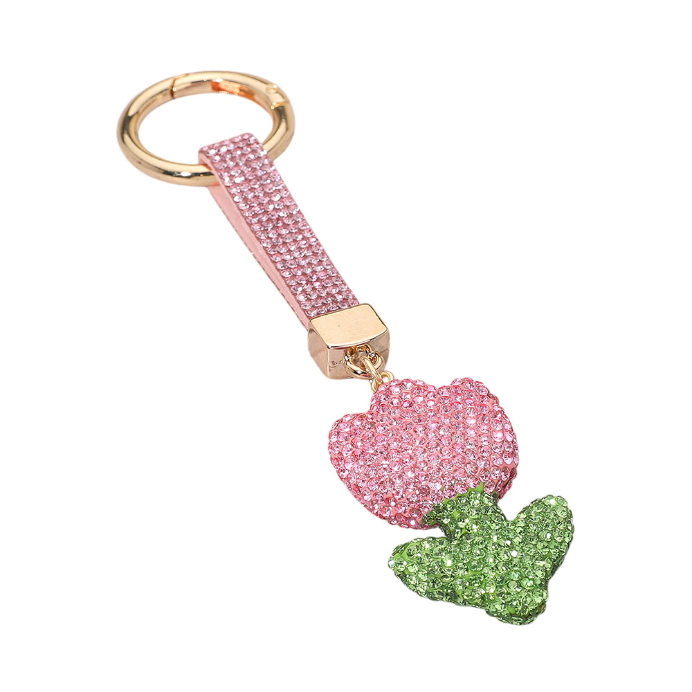 Details • Size : 6" L, 1.3" X 5" • Brighten your style with this sparkling tulip keychain featuring a matching strap. A chic and versatile bag charm or keyring, perfect for accessorizing handbags or keeping keys secure with a touch of floral elegance.