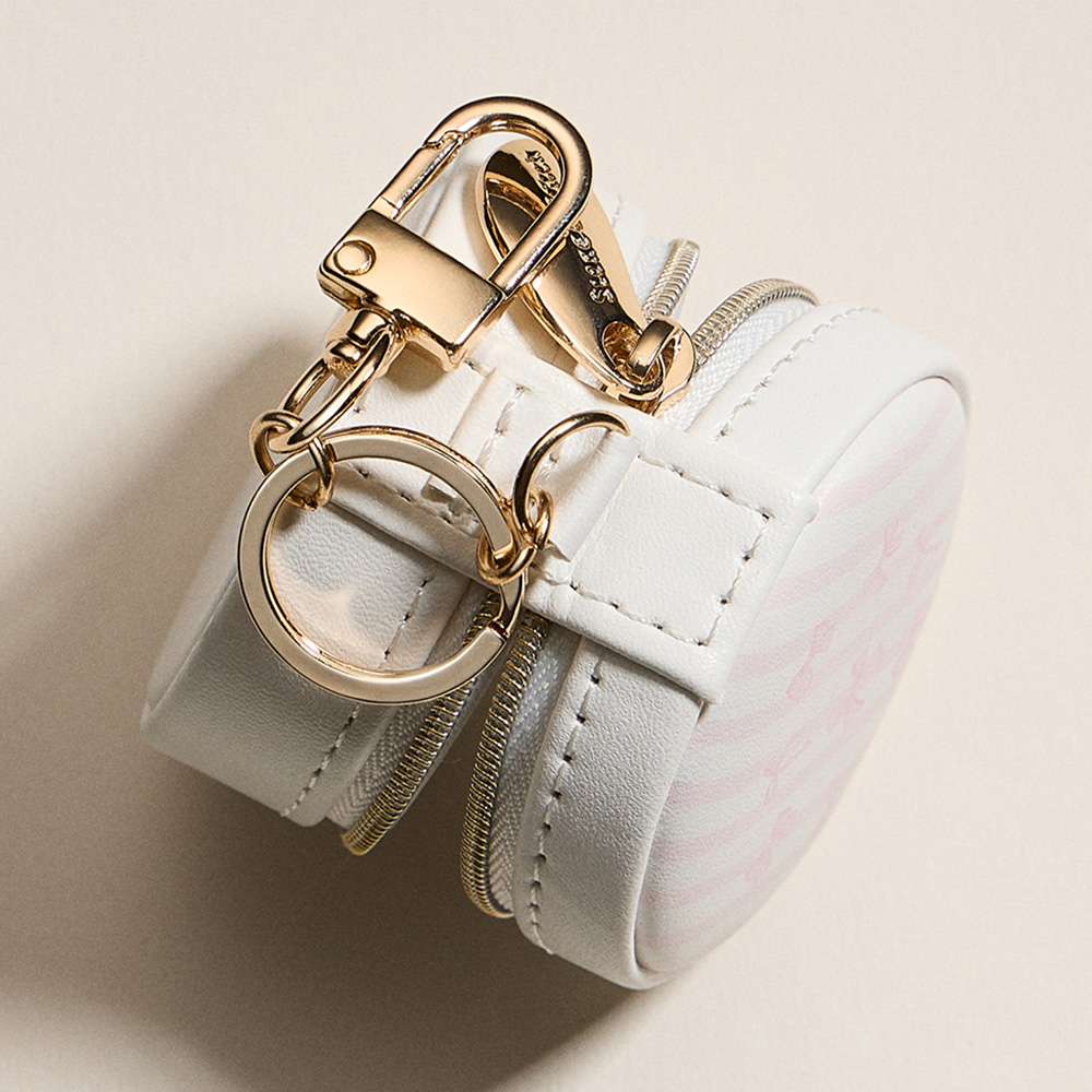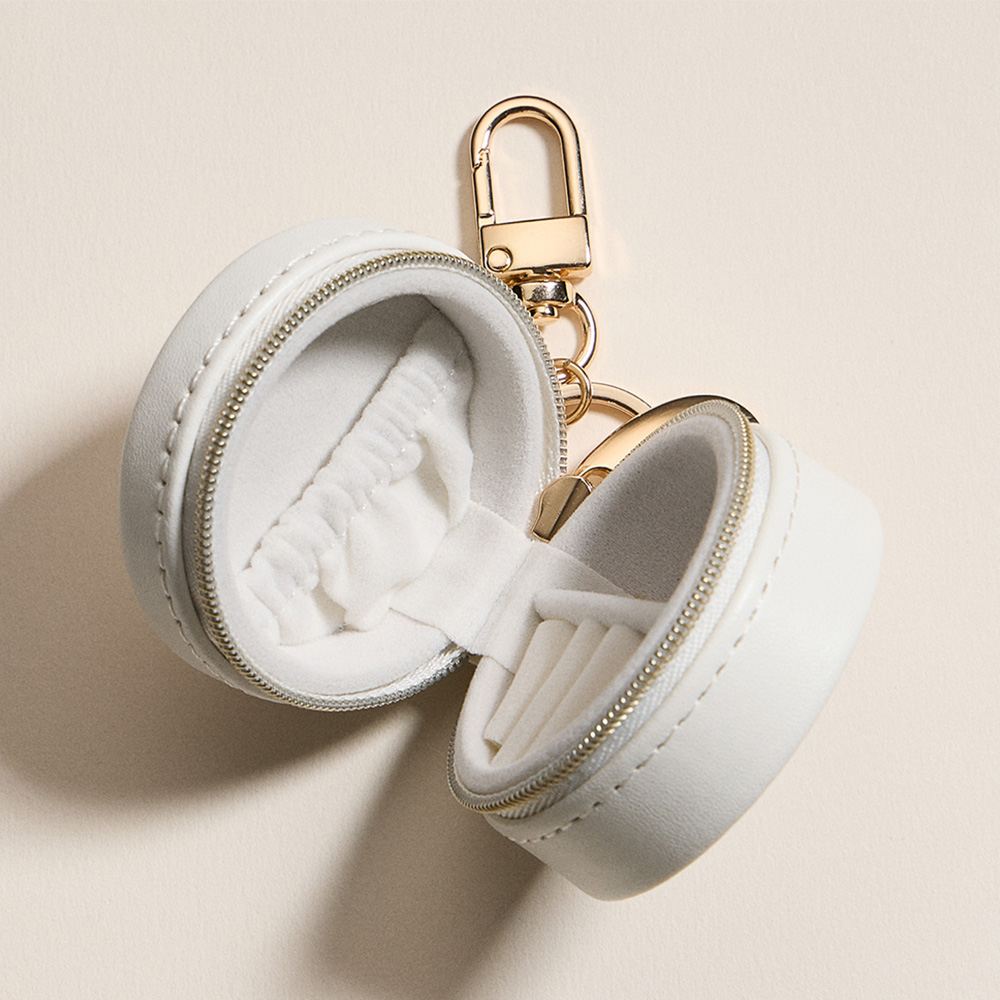 Details • Size : 2.25" X 1.5" • Zipper closure for secure storage • Polished gold-tone keyring with clasp hardware • Compact storage for rings, earrings & small jewelry • Ideal for travel, everyday use, or thoughtful gifts • Keep your jewelry secure and stylish with this heart-shaped travel jewelry case featuring a convenient keychain clip. Compact yet functional, it has slots for rings and compartments for earrings or small accessories, perfect for travel or everyday use.