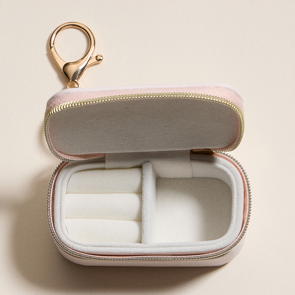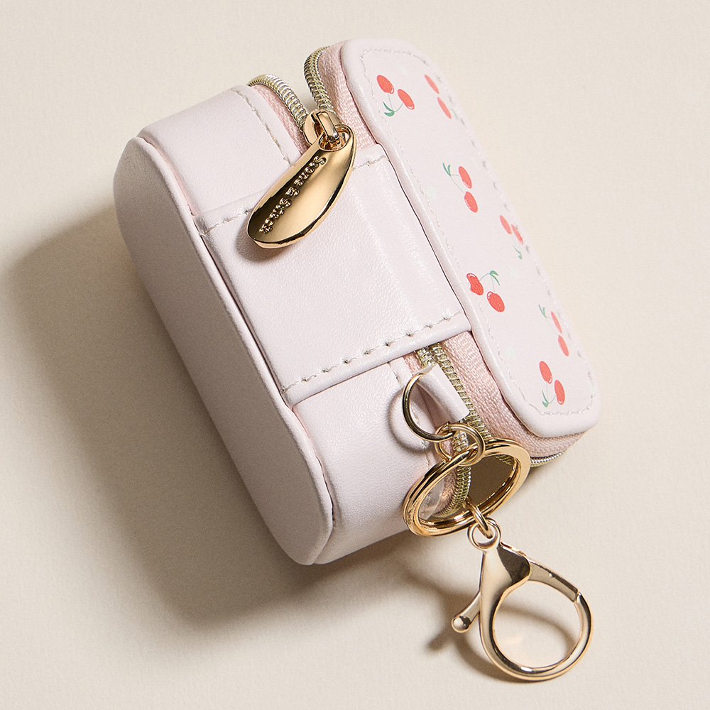 Details • Size : 3" X 1.5" X 1.5" • Zipper closure for secure storage • Polished gold-tone keyring with clasp hardware • Compact storage for rings, earrings & small jewelry • Ideal for travel, everyday use, or thoughtful gifts • Keep your jewelry safe with this rectangular cherry print travel case. Designed with compartments for rings, earrings, and small pieces, it features a zipper closure and keychain hook for convenience. A cute and practical accessory for everyday use or travel.