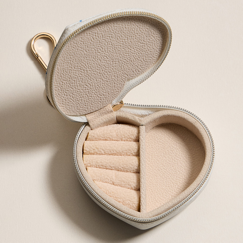 Details • Size : 3" X 2" X 1.25" • Zipper closure for secure storage • Polished gold-tone keyring with clasp hardware • Compact storage for rings, earrings & small jewelry • Ideal for travel, everyday use, or thoughtful gifts • Keep your jewelry safe and organized with this heart-shaped travel case featuring a delicate floral print. Designed with ring slots and compartments, this portable organizer includes a secure zipper closure and keychain clip, perfect for storing rings, earrings, and small accessories anywhere.