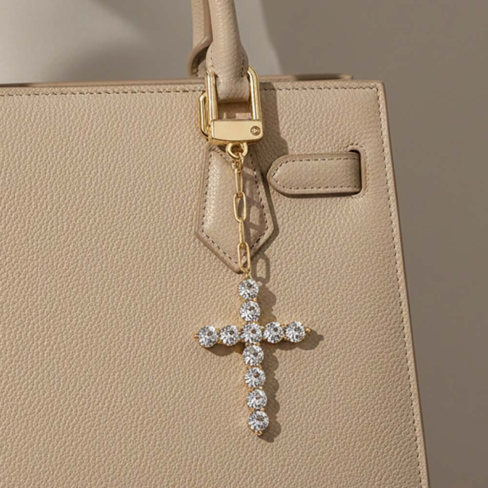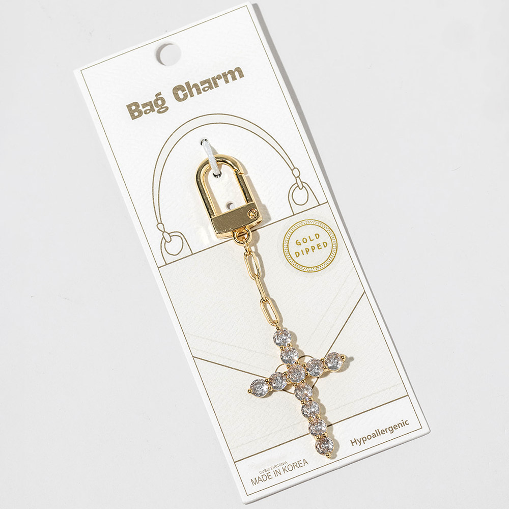 Details • Size : 336" L, 1.1" X 2.6" • Elegant cross bag charm keychain designed with sparkling crystal detailing for a timeless and meaningful statement. Easily clips onto handbags, totes, backpacks, or keys to add refined shine. A versatile accessory ideal for everyday styling, gifting, and boutique collections with symbolic appeal. • CZ Cubic Zirconia • Gold Dipped • Hypoallergenic • Lead and Nickel Compliant • Made In Korea