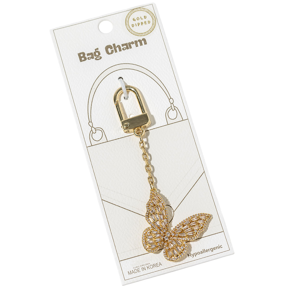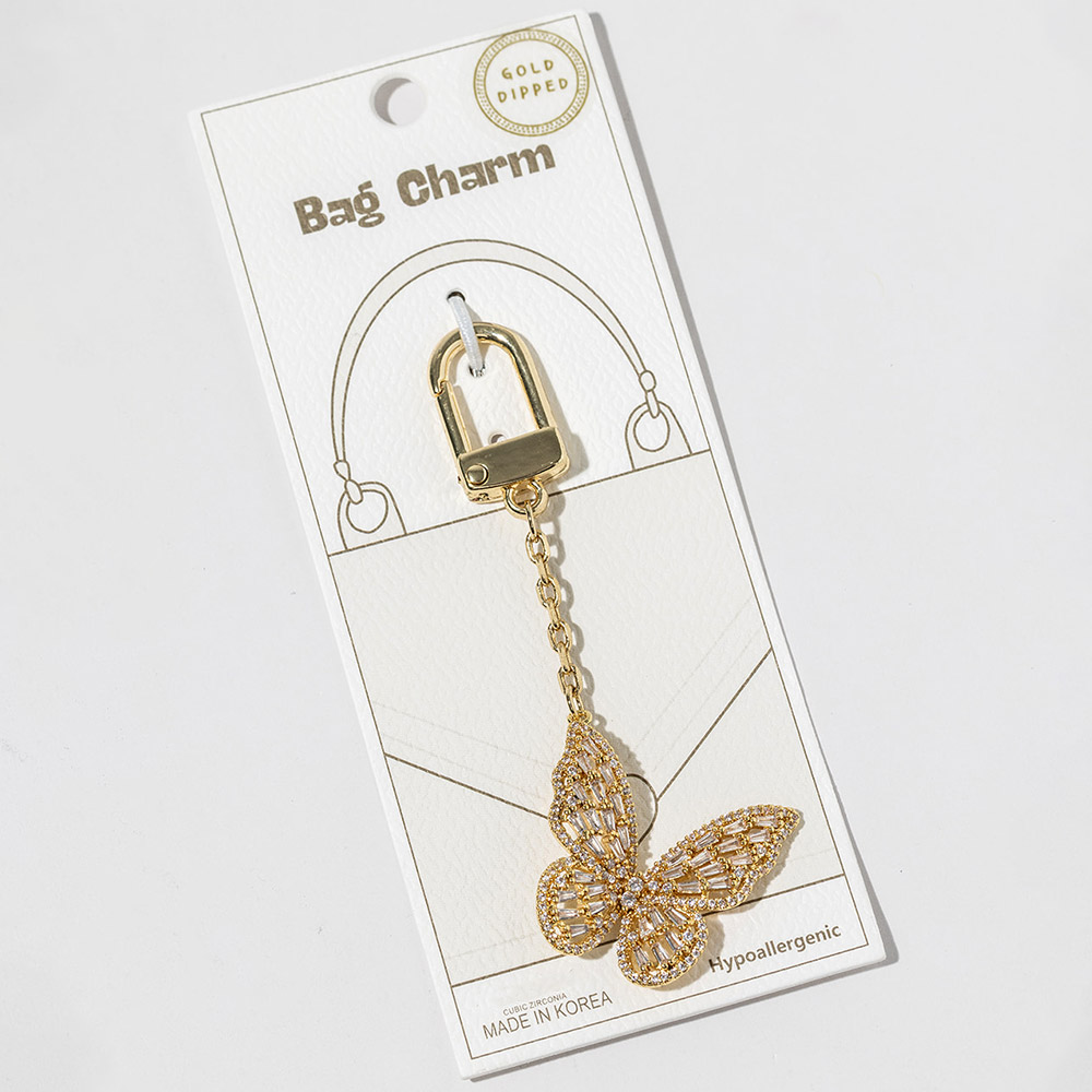 Details • Size : 3.5" L, 1.4" X 2.5" • Elegant butterfly bag charm designed with shimmering crystal accents for a graceful, eye-catching statement. Clips easily onto handbags, totes, backpacks, or keys to add movement and shine. A stylish accessory perfect for gifting, seasonal collections, and boutique displays seeking feminine charm. • CZ Cubic Zirconia • Gold Dipped • Hypoallergenic • Lead and Nickel Compliant • Made In Korea