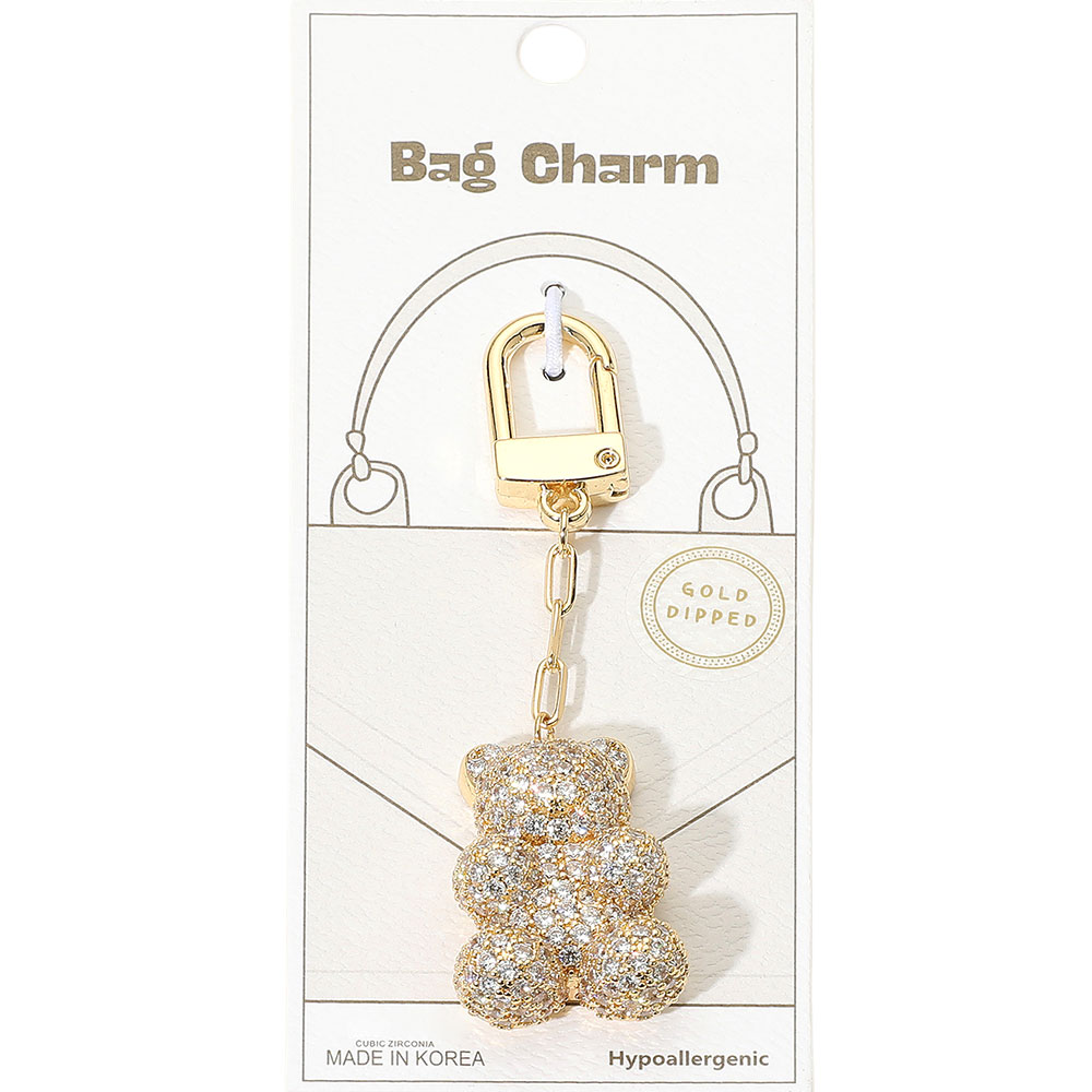 Details • Size : 3.5" L, 1" X 1.6" • Elevate your accessories with this adorable teddy bear bag charm adorned with shimmering cubic zirconia. Perfect for handbags or backpacks, it combines playful style with sparkling elegance. • CZ Cubic Zirconia • Gold Dipped • Hypoallergenic • Lead and Nickel Compliant • Made In Korea