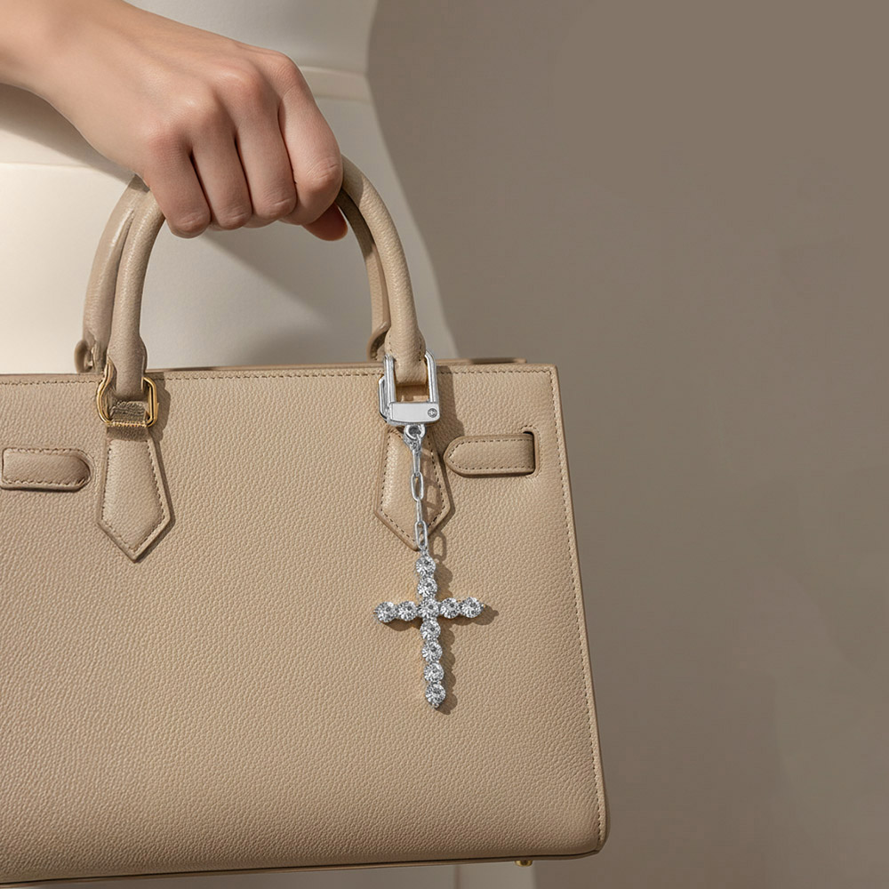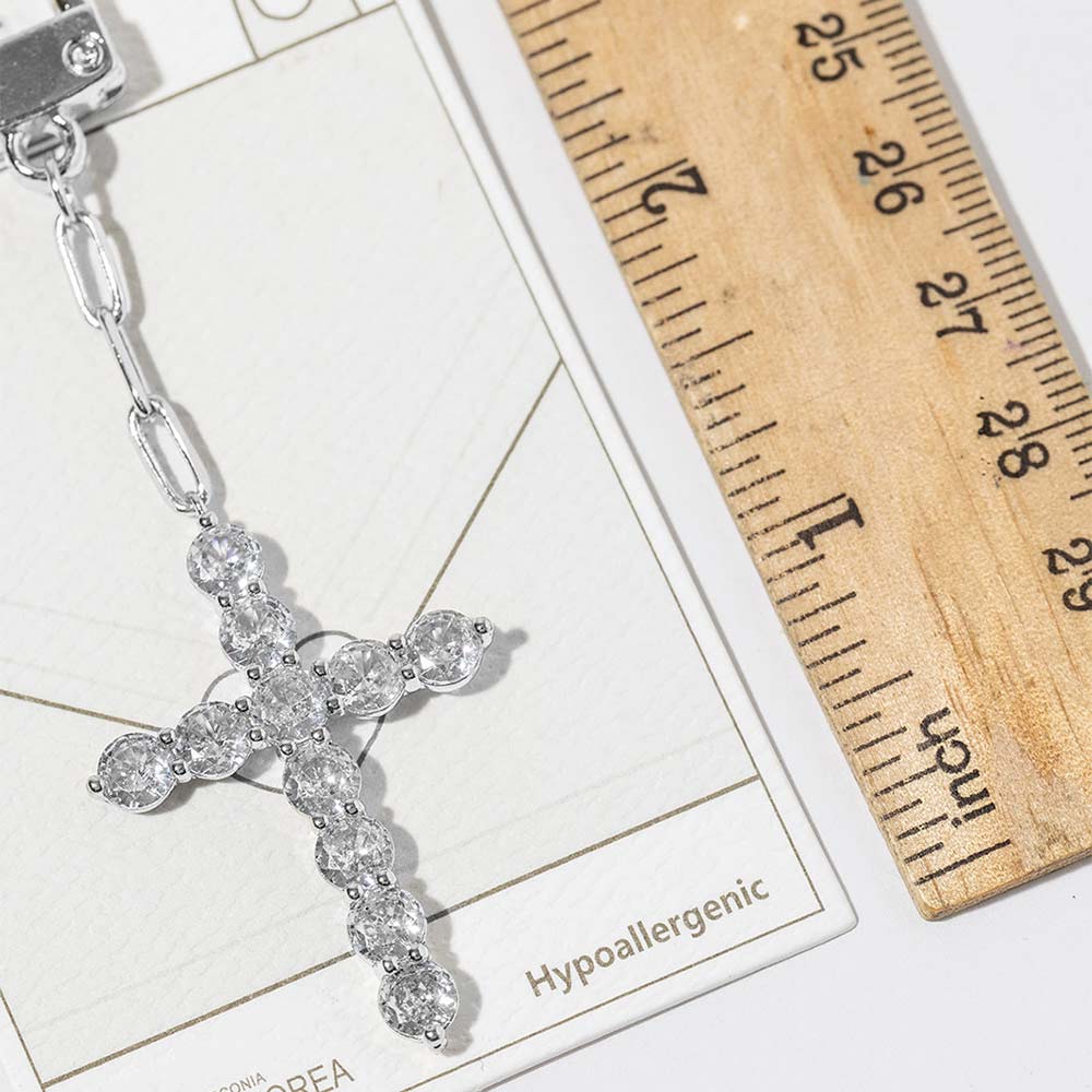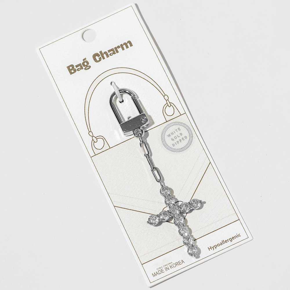 Details • Size : 336" L, 1.1" X 2.6" • Elegant cross bag charm keychain designed with sparkling crystal detailing for a timeless and meaningful statement. Easily clips onto handbags, totes, backpacks, or keys to add refined shine. A versatile accessory ideal for everyday styling, gifting, and boutique collections with symbolic appeal. • CZ Cubic Zirconia • Gold Dipped • Hypoallergenic • Lead and Nickel Compliant • Made In Korea