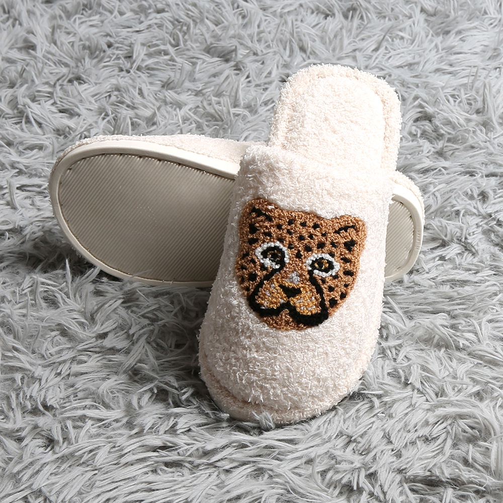 Details • Size : S/M (Women 6-8, Men 5-7) • Material : 100% Poly. Microfiber • Step into comfort with these cozy indoor slippers featuring a playful leopard face embroidery. Designed for softness and warmth, they add a fun animal-themed touch to your lounging routine, making them a perfect everyday essential or gift.