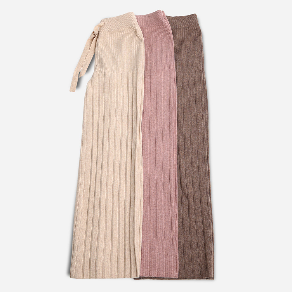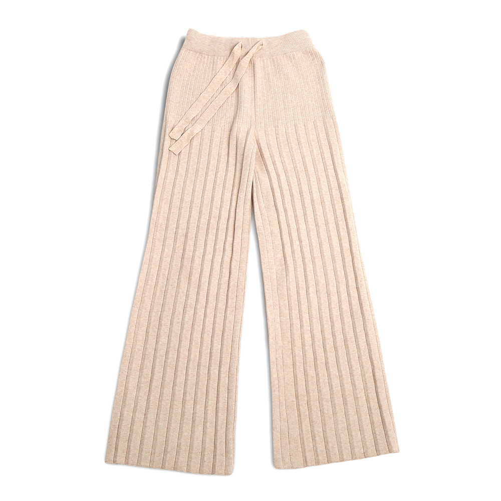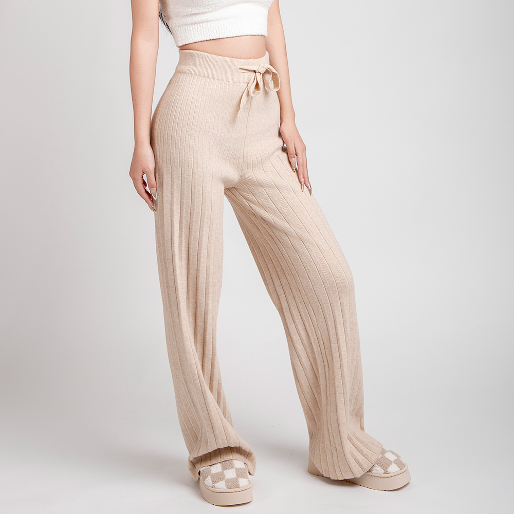 Details • Size : One Size • Material : 65% Polyester, 35% Acrylic • Features : Adjustable drawstring and elastic waistband • Care : Machine wash on the cold and gentle cycle, do not bleach, lay flat to dry or tumble dry on low, iron or steam on low, do not dry clean • Stay cozy and chic in these high-waist ribbed knit lounge pants. Featuring a flattering wide-leg silhouette and an adjustable tie waist, they offer the perfect balance of comfort and effortless style—ideal for relaxing at home or creating a relaxed, casual look.