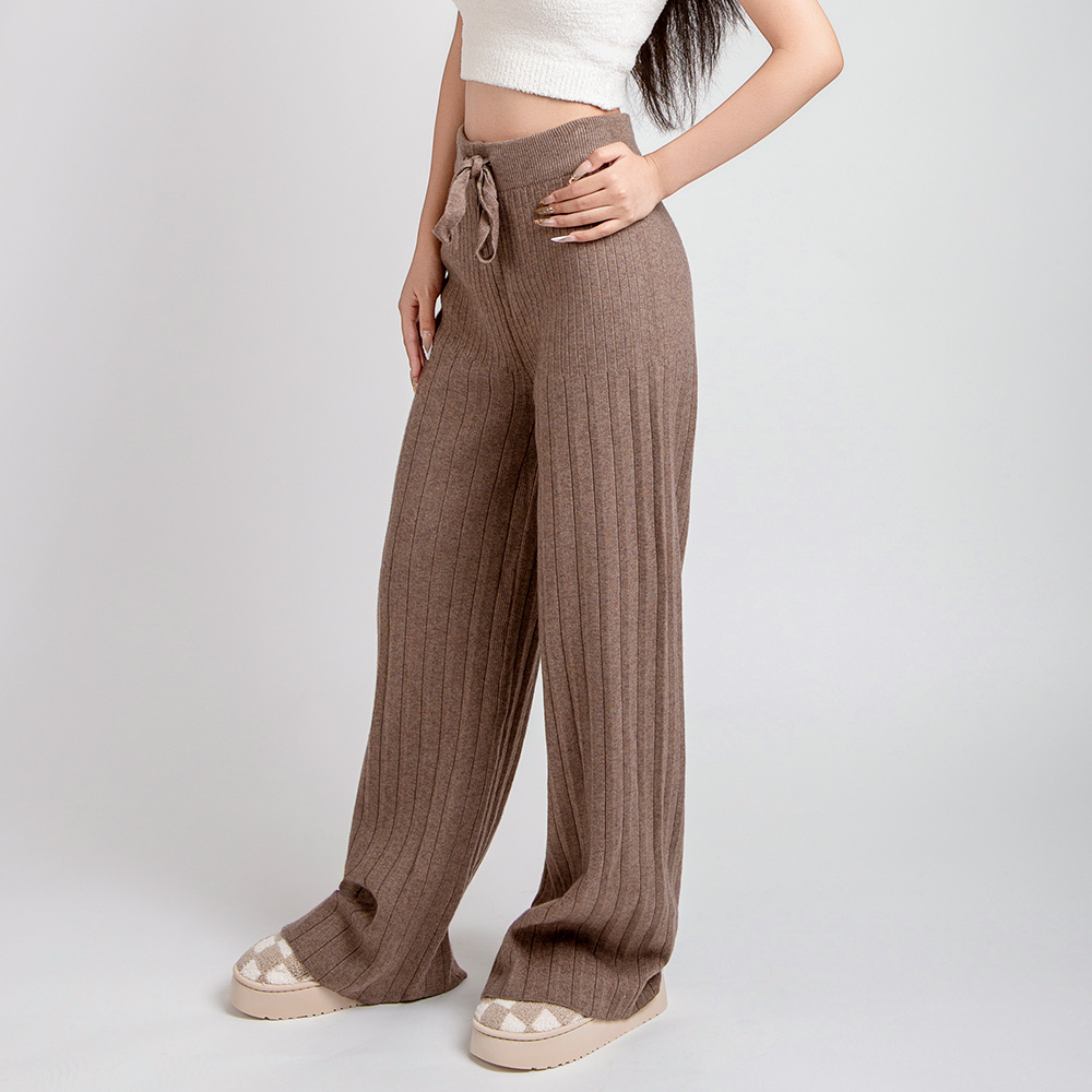 • Stay cozy and chic in these high-waist ribbed knit lounge pants. Featuring a flattering wide-leg silhouette and an adjustable tie waist, they offer the perfect balance of comfort and effortless style—ideal for relaxing at home or creating a relaxed, casual look.
