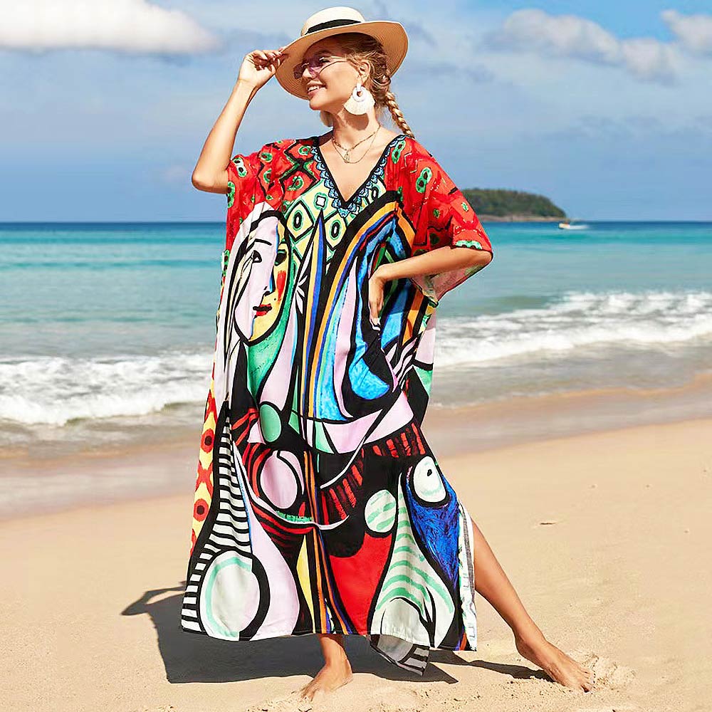 Details • Size : One Size • This art-inspired V-neck kaftan maxi dress offers a relaxed silhouette designed for comfort and statement style. Ideal for beach outings, vacations, and boutique resort collections, it features an easy pull-on fit with fluid drape that transitions effortlessly from daytime lounging to elevated casual wear.