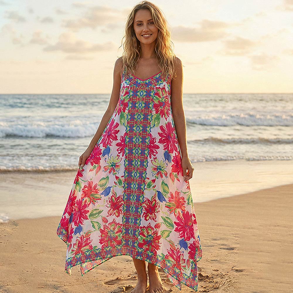 Details • Size : One Size • This boho floral print beach maxi dress features a flowy silhouette with a breezy drape designed for warm weather wear. Ideal for vacations, beach days, resort styling, and casual summer outings, it offers effortless comfort and eye-catching appeal. A versatile statement piece for boutique collections, cruise wear, and easy day-to-night styling.