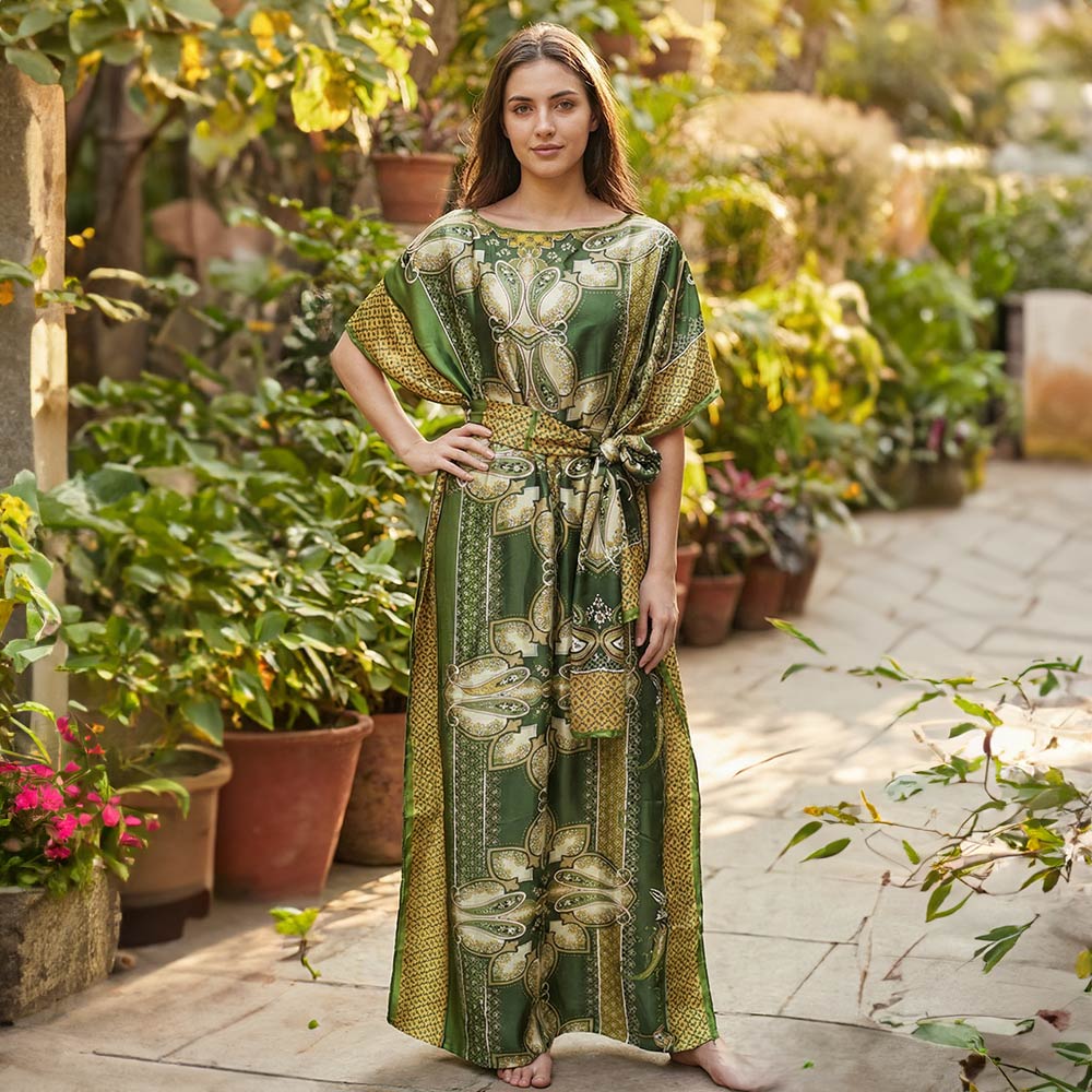 Elegant Print Resort Silky Kaftan Maxi Dress