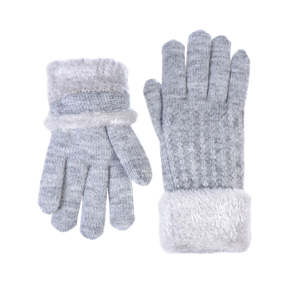 Details • One Size Fits Most • 80% Acrylic, 20% Nylon • Lining: 100% Nylon • Soft winter knit gloves featuring cozy plush cuffs and a textured knit pattern for warmth and comfort. Designed to keep hands insulated in cold weather, these stylish gloves offer a snug fit and elegant look, perfect for daily wear and outdoor winter activities.