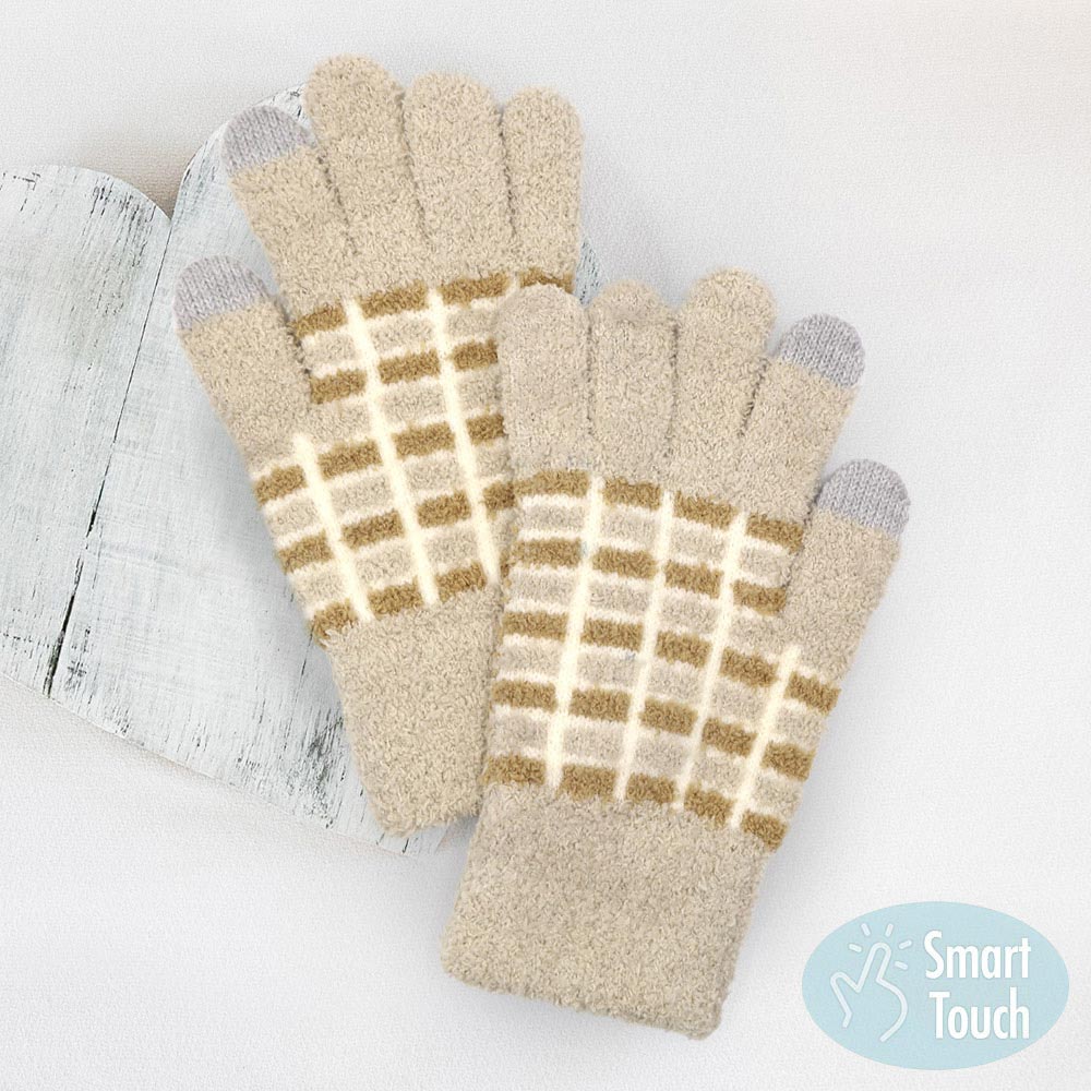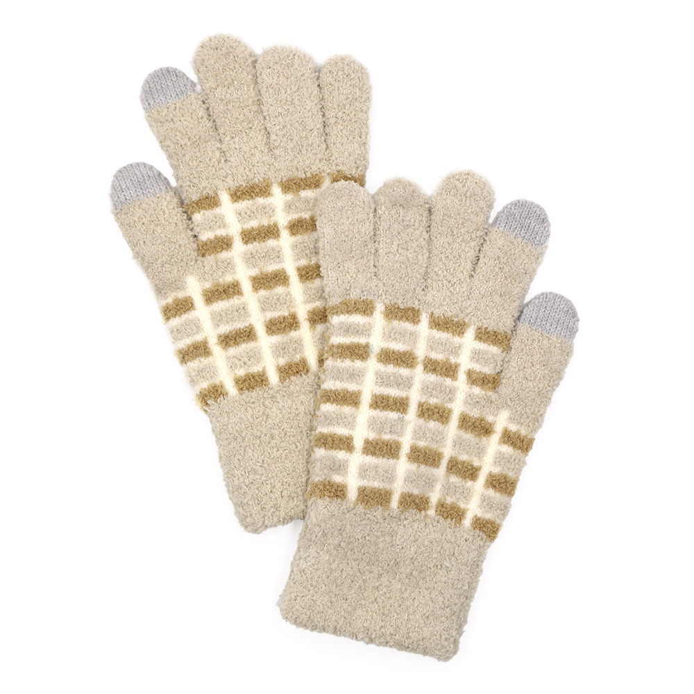 Details • Size : One Size • Material : 100% Polyester • Smart Touch • Soft and cozy winter gloves designed with a stylish grid pattern and smart-touch fingertips for easy phone use on the go. These warm, comfortable gloves offer a snug fit, ideal for daily commutes, outdoor activities, or gifting. A practical cold-weather essential with modern functionality.