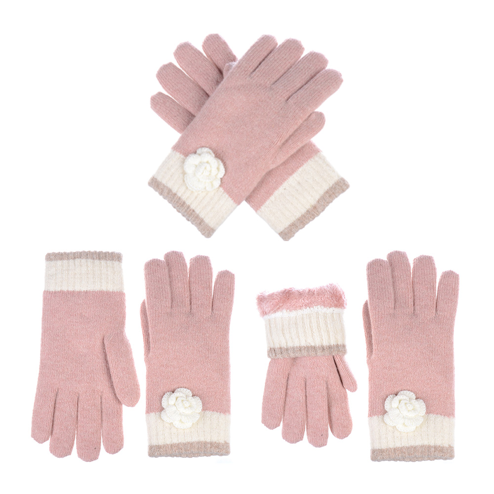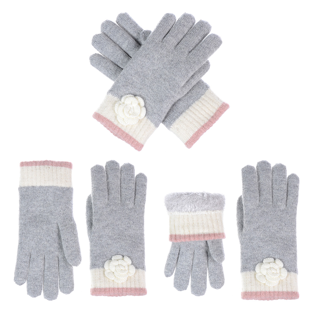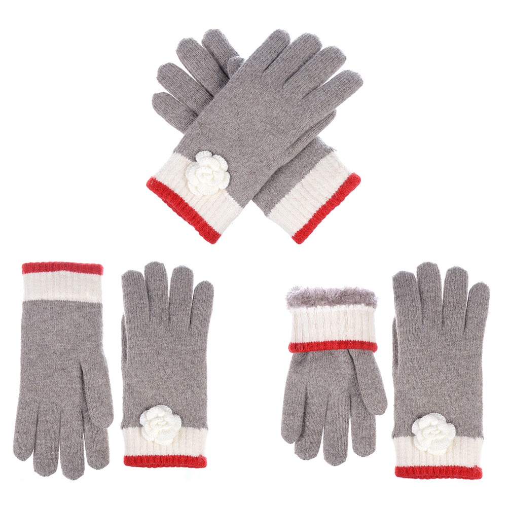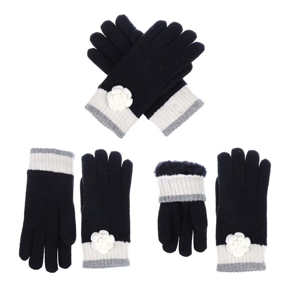 Details • Size : One Size • Material : 70% Acrylic, 30% Wool • Lining Material : 100% Nylon • Soft knit gloves featuring a delicate floral accent and contrast cuff design for a touch of charm and warmth. Perfect for keeping hands cozy during chilly days, these stylish gloves blend comfort with elegance, making them an ideal cold-weather accessory.