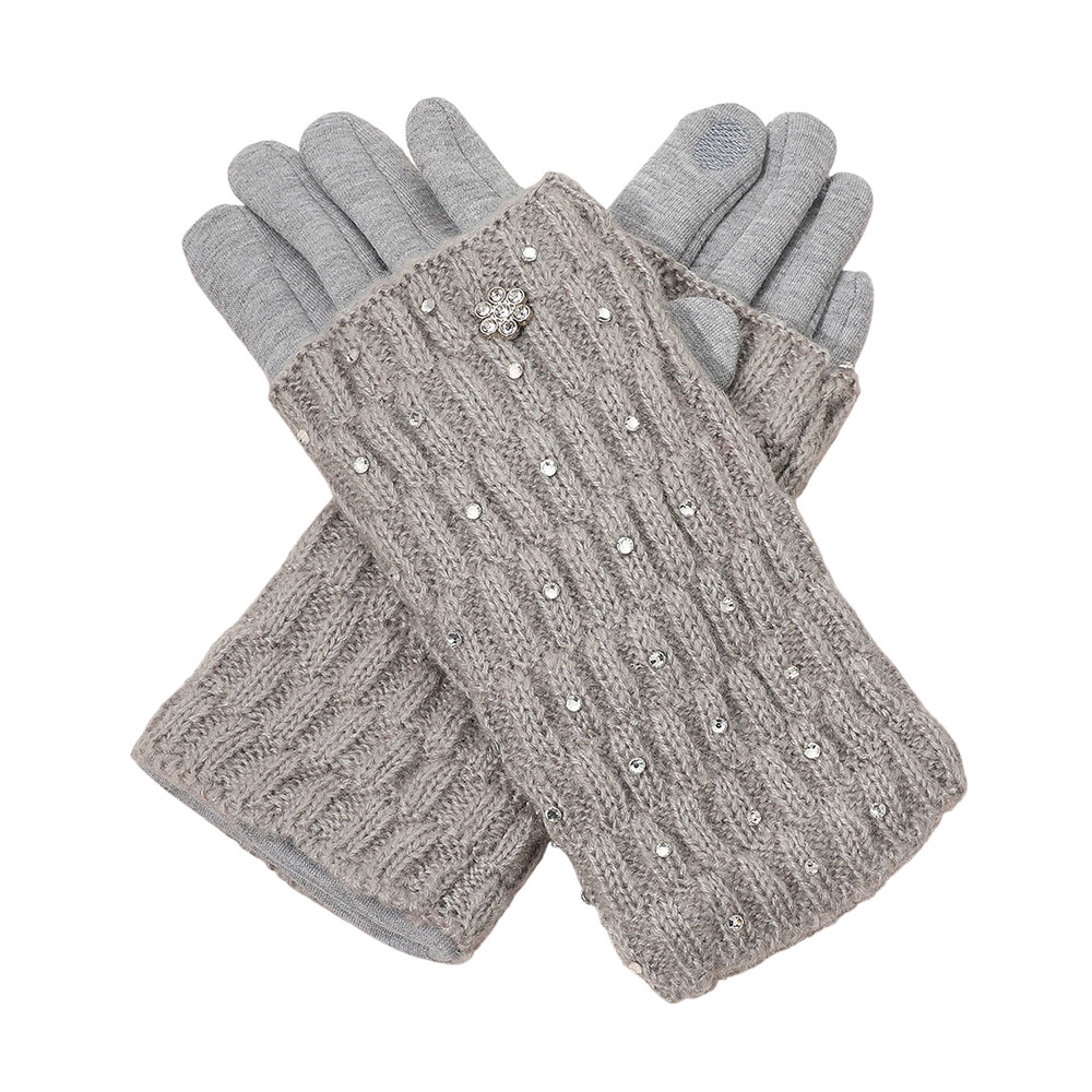 Details • Size : One Size (9.5" L) • Material : 100% Polyester • Smart Touch • Stay stylish and connected with these cozy knit gloves featuring elegant rhinestone accents and Smart Touch fingertips. Designed for comfort and convenience, they keep your hands warm while letting you use your devices effortlessly in cold weather.