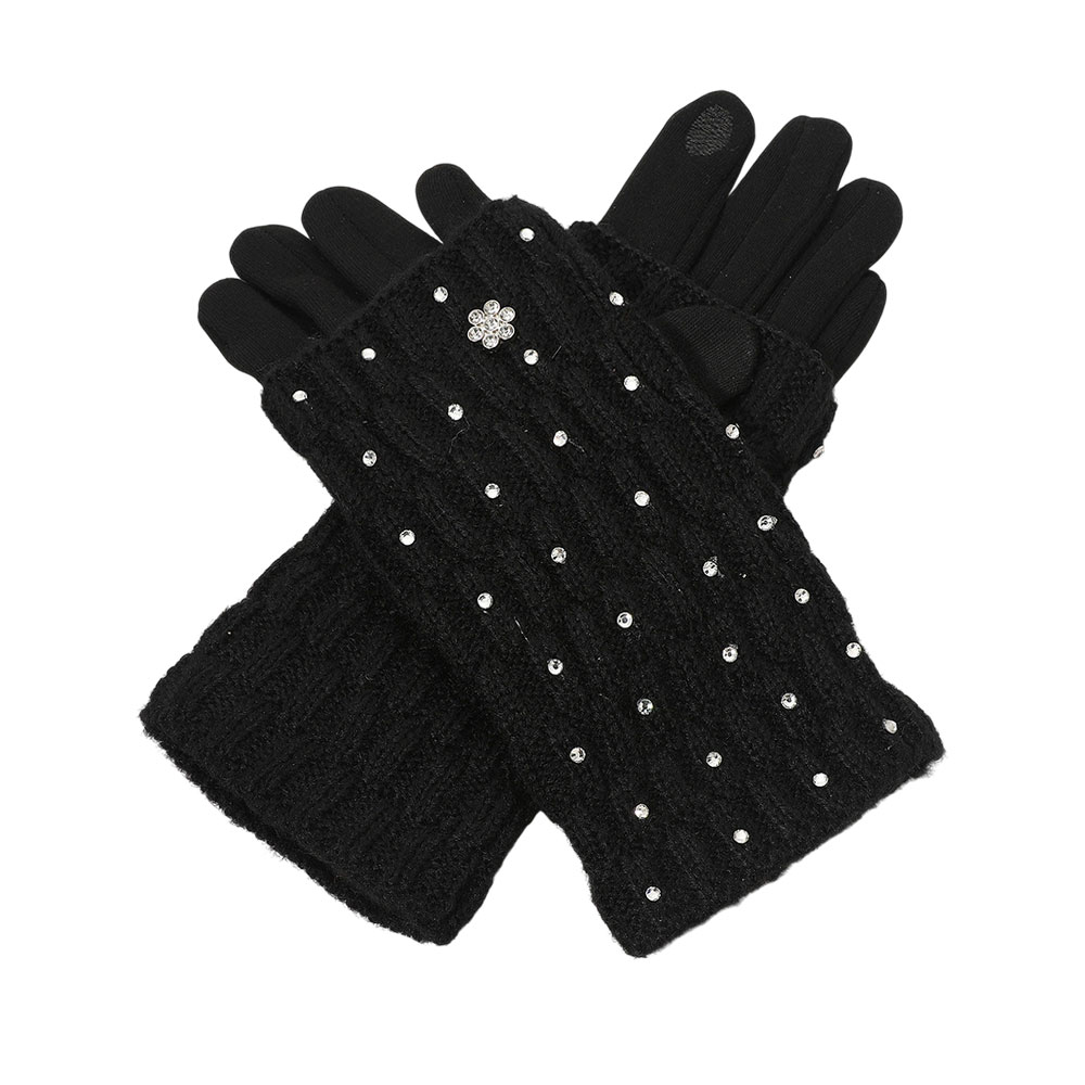 Details • Size : One Size (9.5" L) • Material : 100% Polyester • Smart Touch • Stay stylish and connected with these cozy knit gloves featuring elegant rhinestone accents and Smart Touch fingertips. Designed for comfort and convenience, they keep your hands warm while letting you use your devices effortlessly in cold weather.