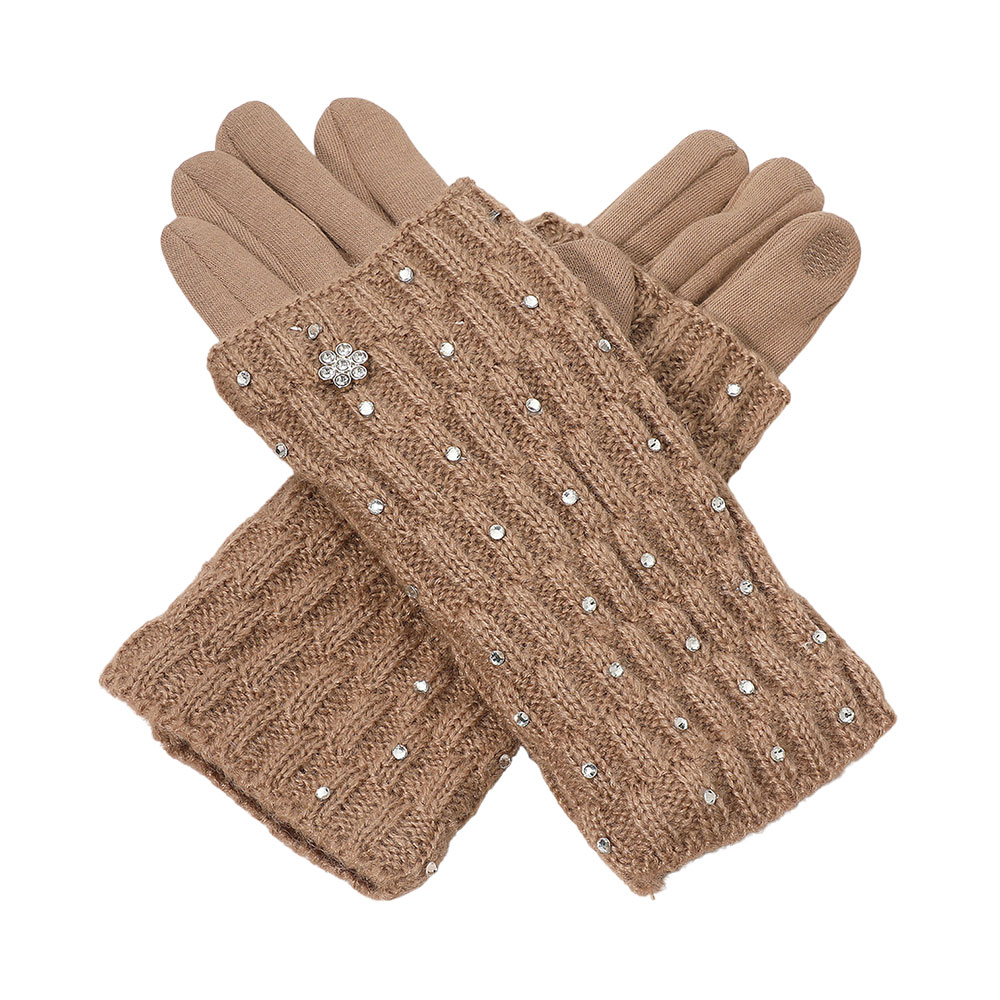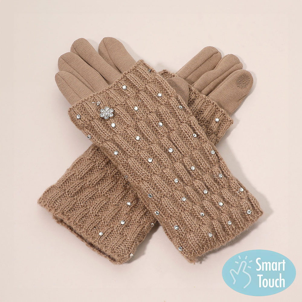 • Stay stylish and connected with these cozy knit gloves featuring elegant rhinestone accents and Smart Touch fingertips. Designed for comfort and convenience, they keep your hands warm while letting you use your devices effortlessly in cold weather.