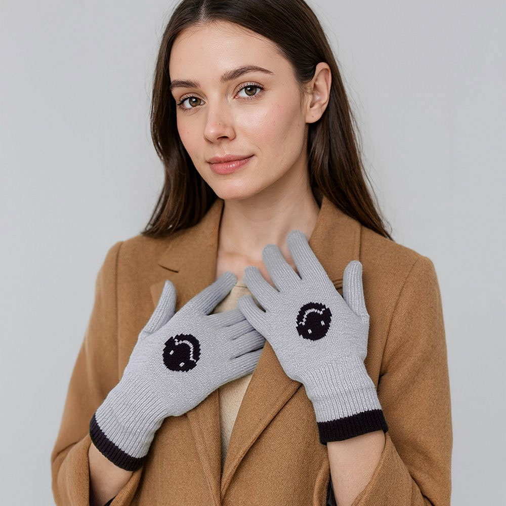 • Playful knit gloves with smiley face design and smart touch technology for effortless device use. Warm, practical, and stylish, these gloves are perfect for adding comfort and personality to your cold-weather outfits.
