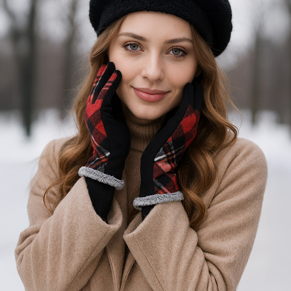 • Stylish plaid gloves designed with smart touch technology for easy phone use. A cozy winter accessory combining warmth, comfort, and practicality, perfect for keeping hands protected while staying connected outdoors or on the go.