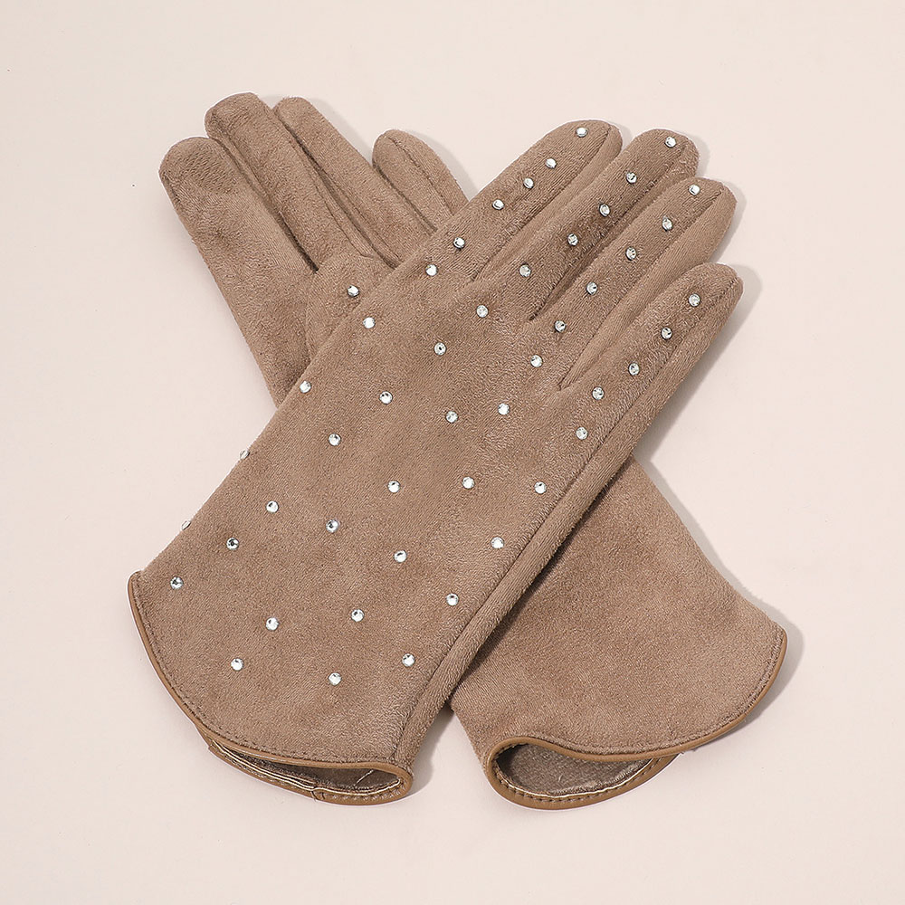 Details • Size : One Size (9" L) • Material : 100% Polyester • Smart Touch • Elegant smart touch gloves adorned with sparkling rhinestones and a sleek trim finish. These stylish gloves combine comfort with functionality, allowing touchscreen use while keeping hands warm and chic — perfect for both casual outings and sophisticated cold-weather looks.