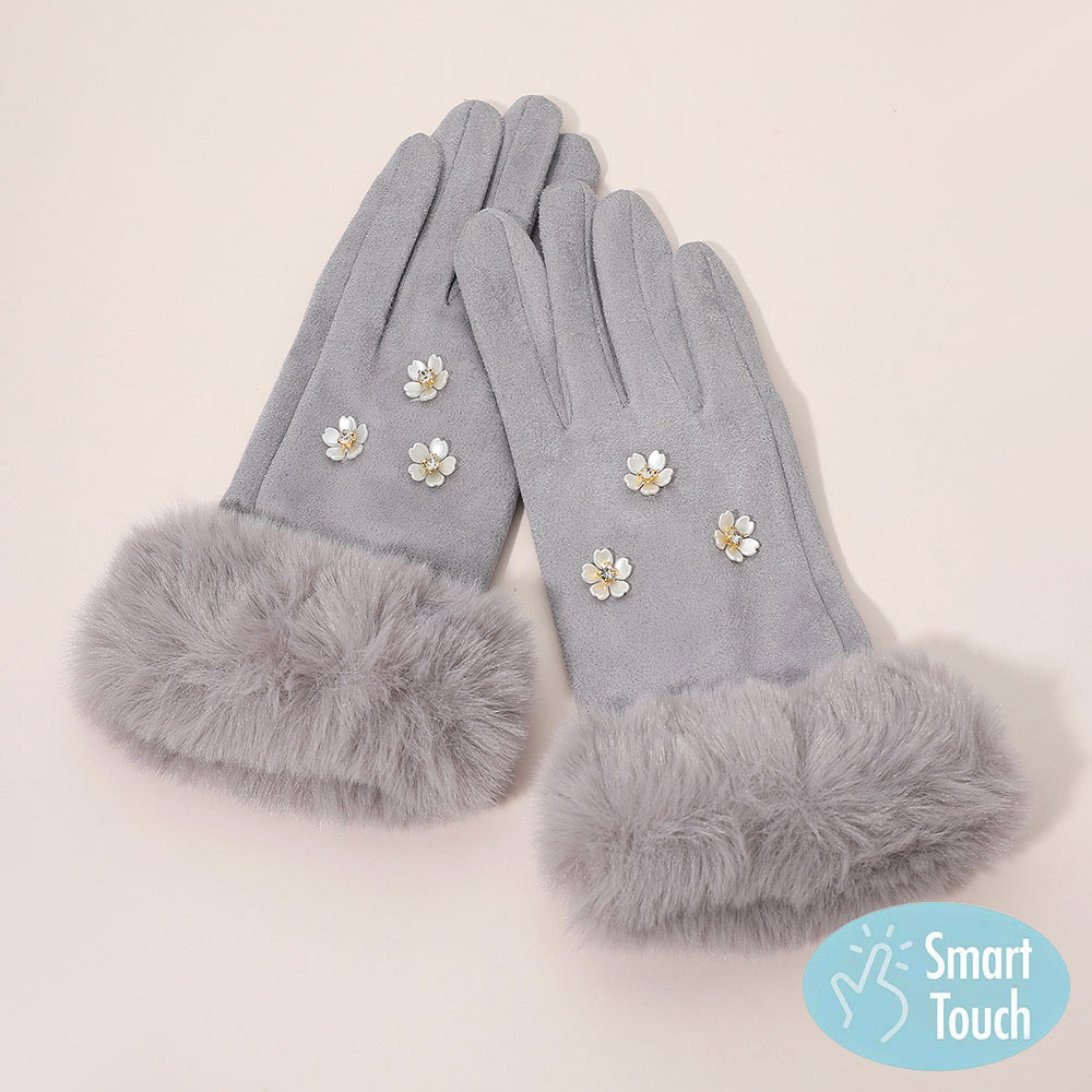Rhinestone Flower Embellished Faux Fur Cuff Smart Touch Winter Gloves