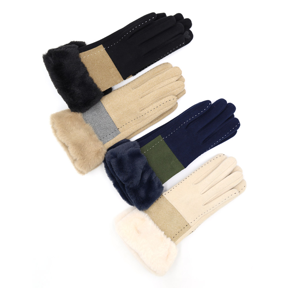 Two Tone And Stitch Lines Faux Fur Cuff Smart Touch Gloves