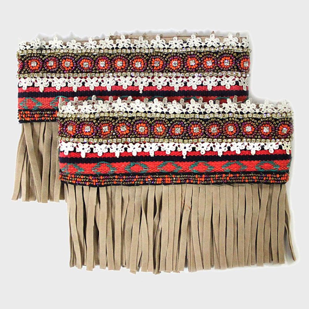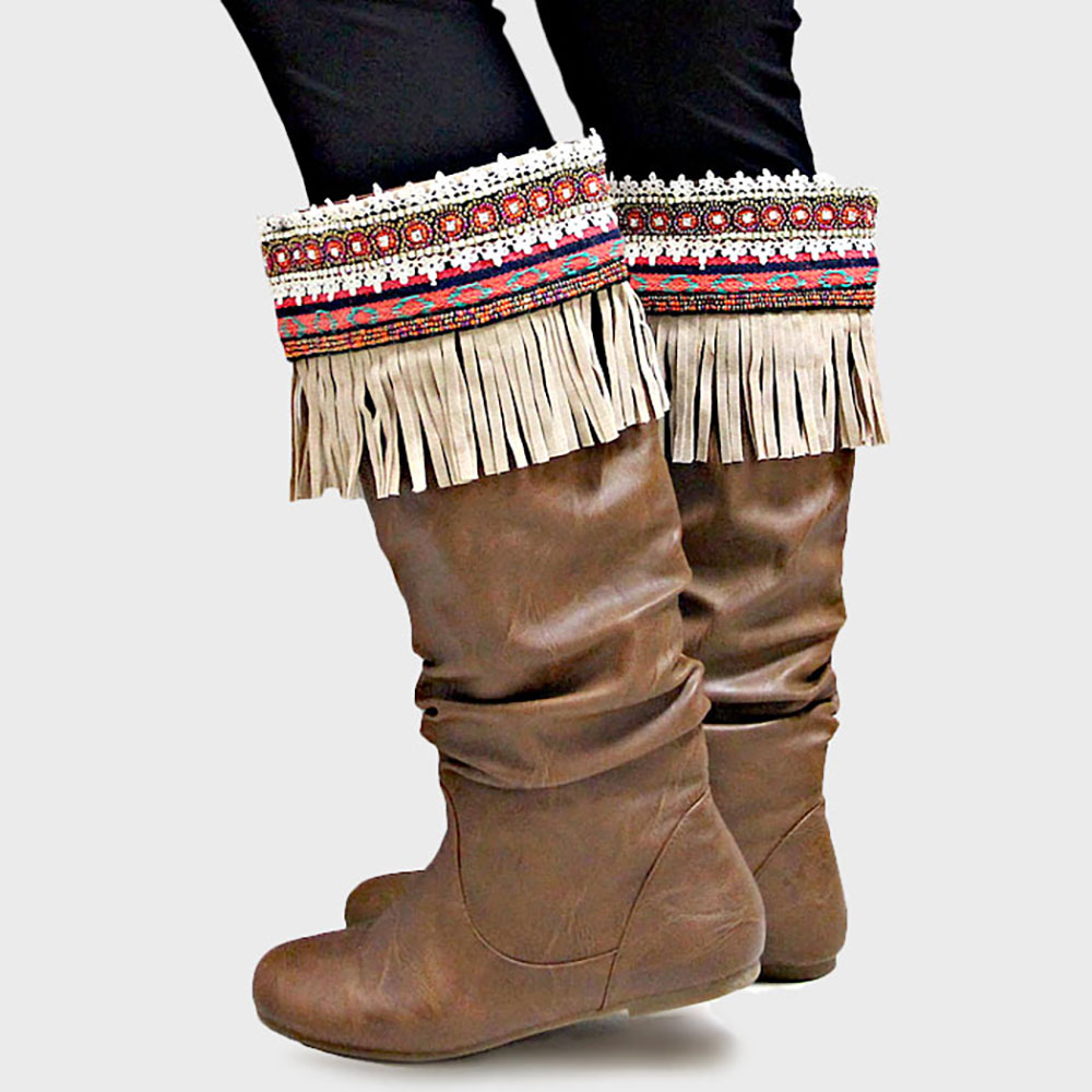 Details • Size : 18" X 5" • Velcro Closure • These bohemian fringe boot cuff accessories feature intricate embroidered detailing and playful fringe for a vibrant, free-spirited look. Designed to slip easily over boots, they add instant personality and charm, perfect for enhancing casual, festival, or western-inspired outfits.