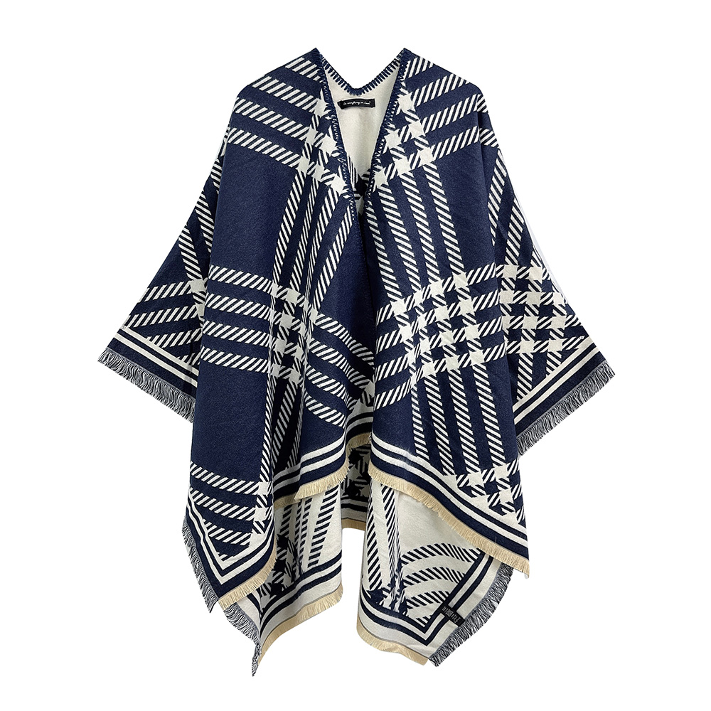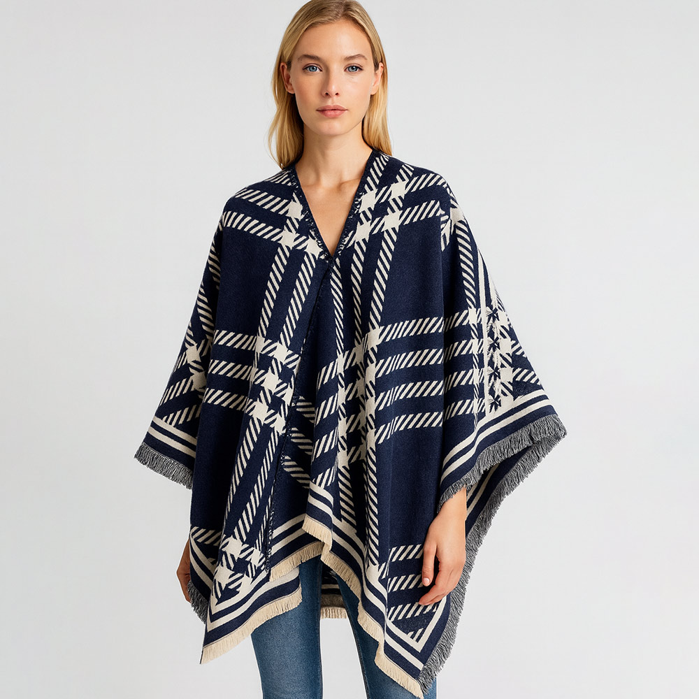 • Stay effortlessly stylish with this geometric pattern poncho featuring a timeless design and fringed hem. Its draped silhouette and modern detailing make it a versatile layering piece, adding refined charm and cozy elegance to both casual and chic ensembles.