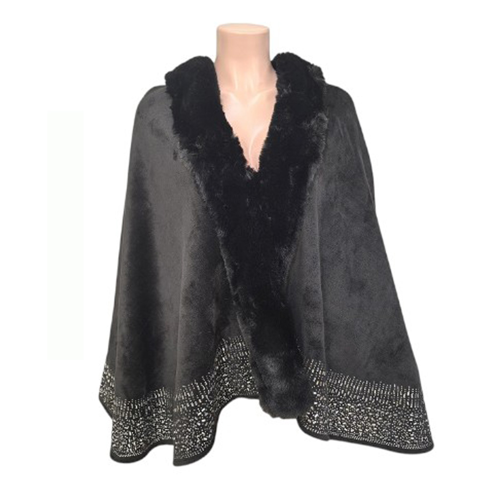 Faux Fur Trim Rhinestone Embellished Hem Poncho Shawl