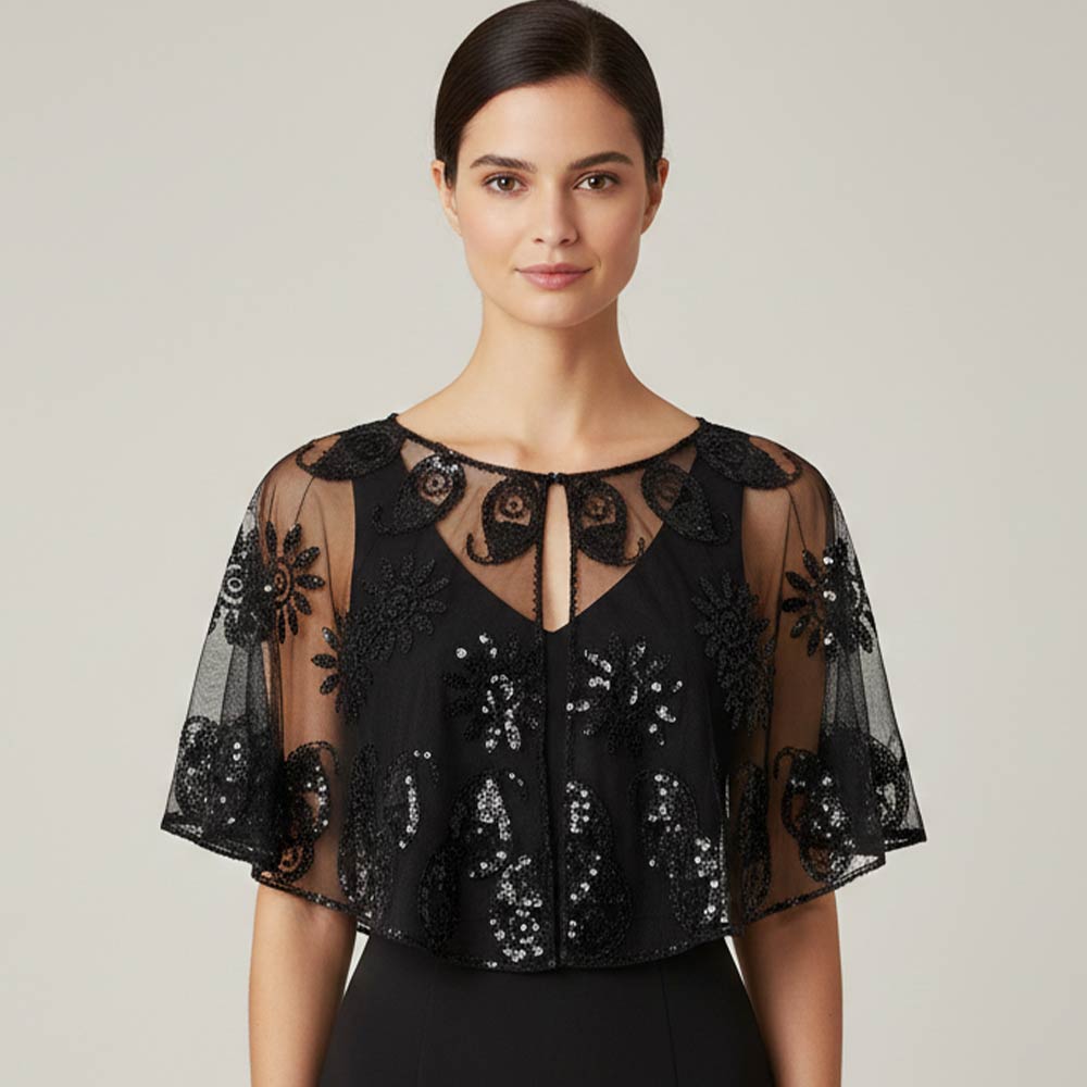Floral Sequin Embellished Sheer Cape Shawl Top