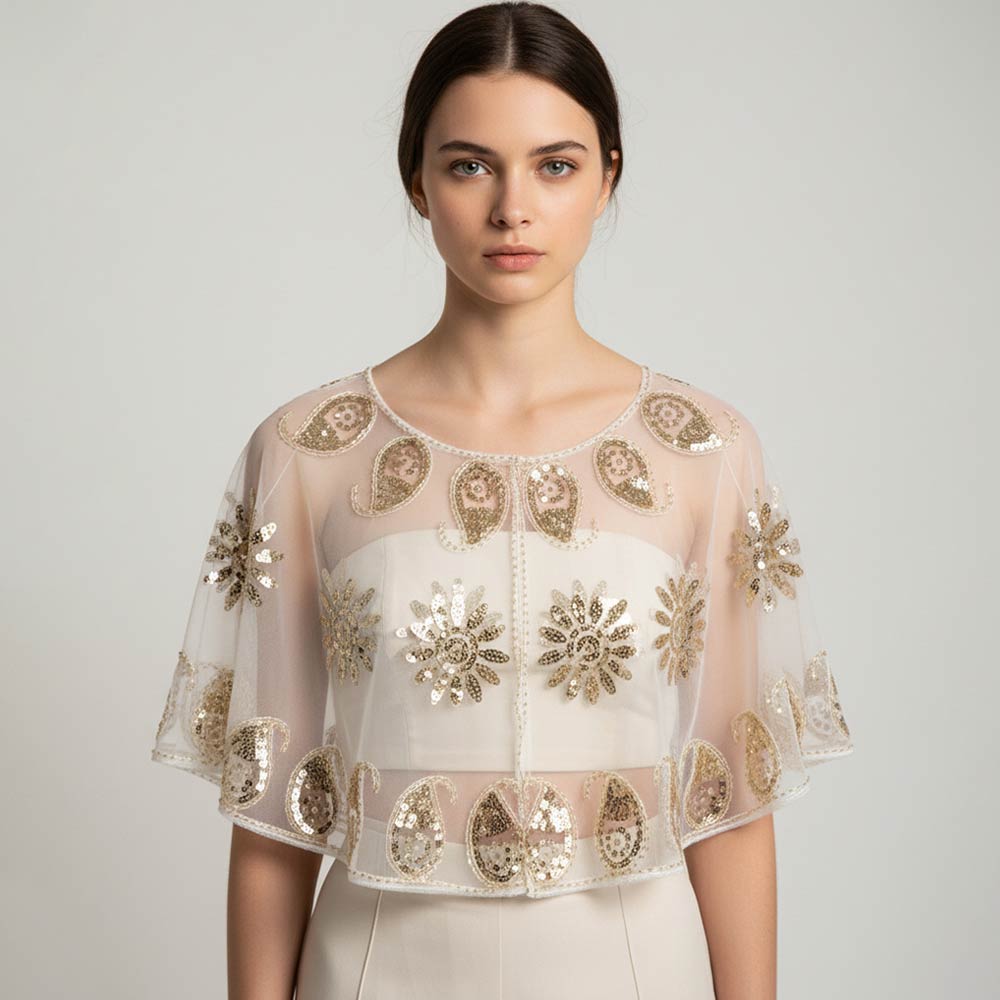 Floral Sequin Embellished Sheer Cape Shawl Top