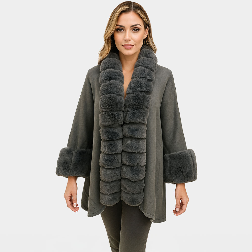 Details • Size : One Size • Wrap yourself in timeless elegance with this faux fur trim cape shawl. Featuring plush detailing along the collar and cuffs, it offers a luxurious touch and exceptional warmth. Perfect for layering over any outfit, this statement piece combines classic sophistication with cozy comfort.