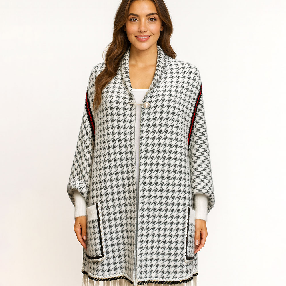 • A chic open-front cardigan wrap featuring an oversized houndstooth pattern, contrast trim, roomy sleeves, and fringe hem. Designed for comfort and style, it layers effortlessly over casual or dressy outfits, making it perfect for everyday wear, travel, or gifting.