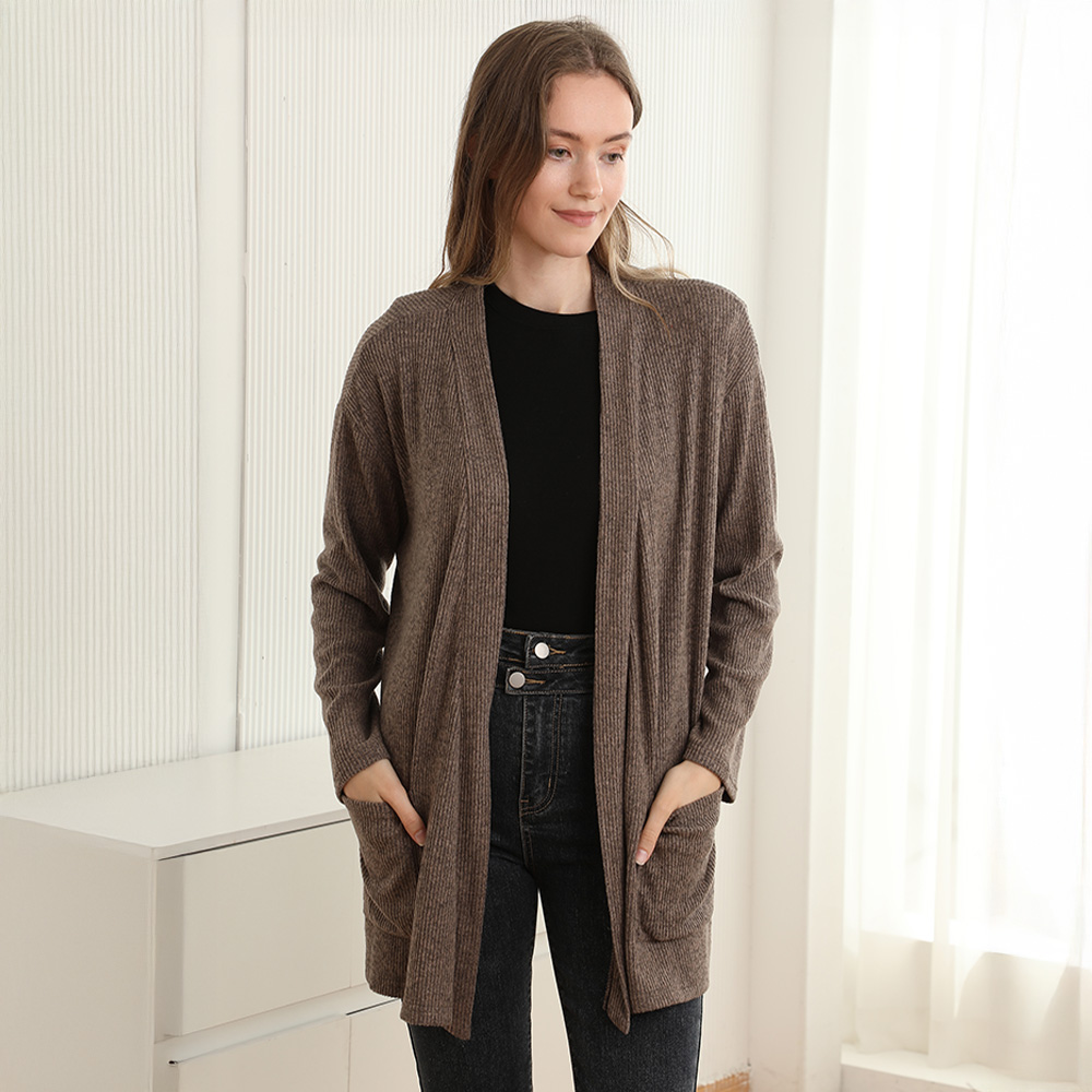 Details • Size : One Size • Material : 100% Acrylic • A versatile open-front cardigan designed with a relaxed silhouette and practical pockets. Perfect for layering over casual or office looks, this lightweight cardigan adds comfort and effortless style to any outfit, making it a go-to wardrobe essential for every season.