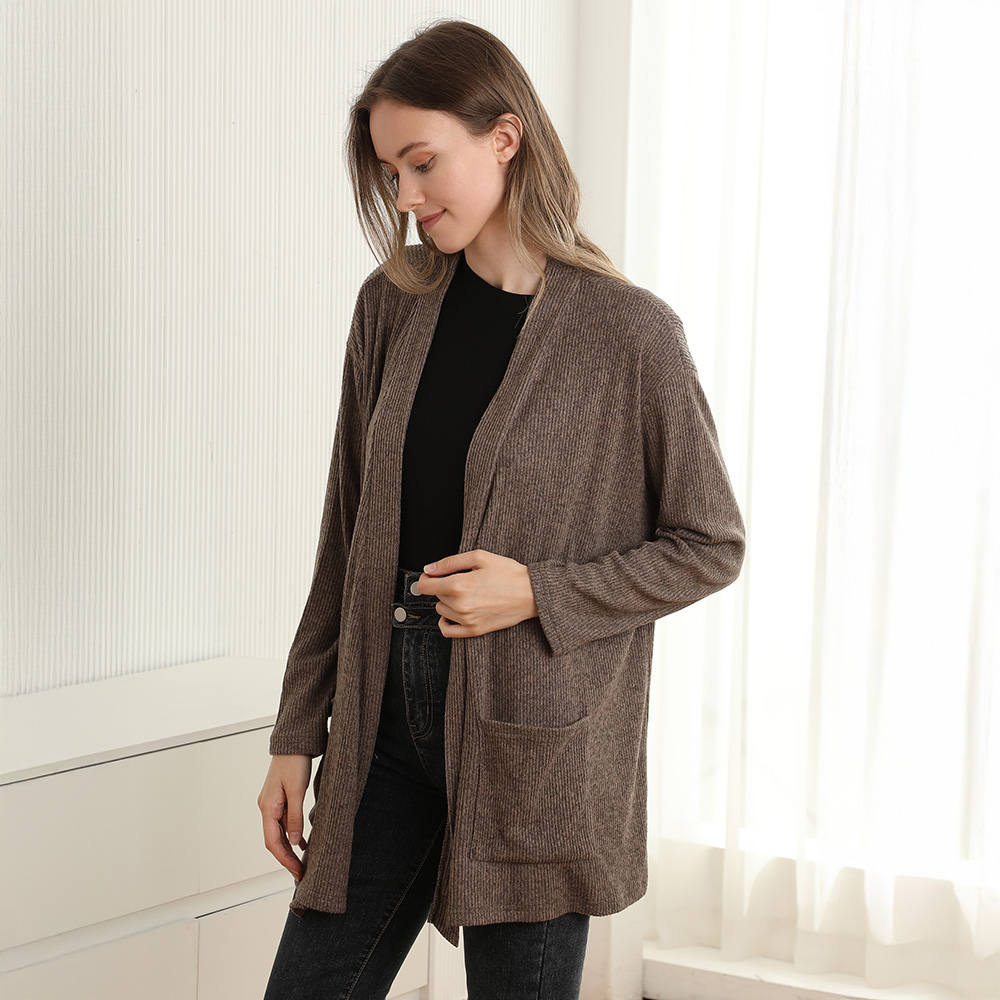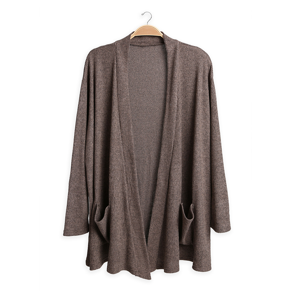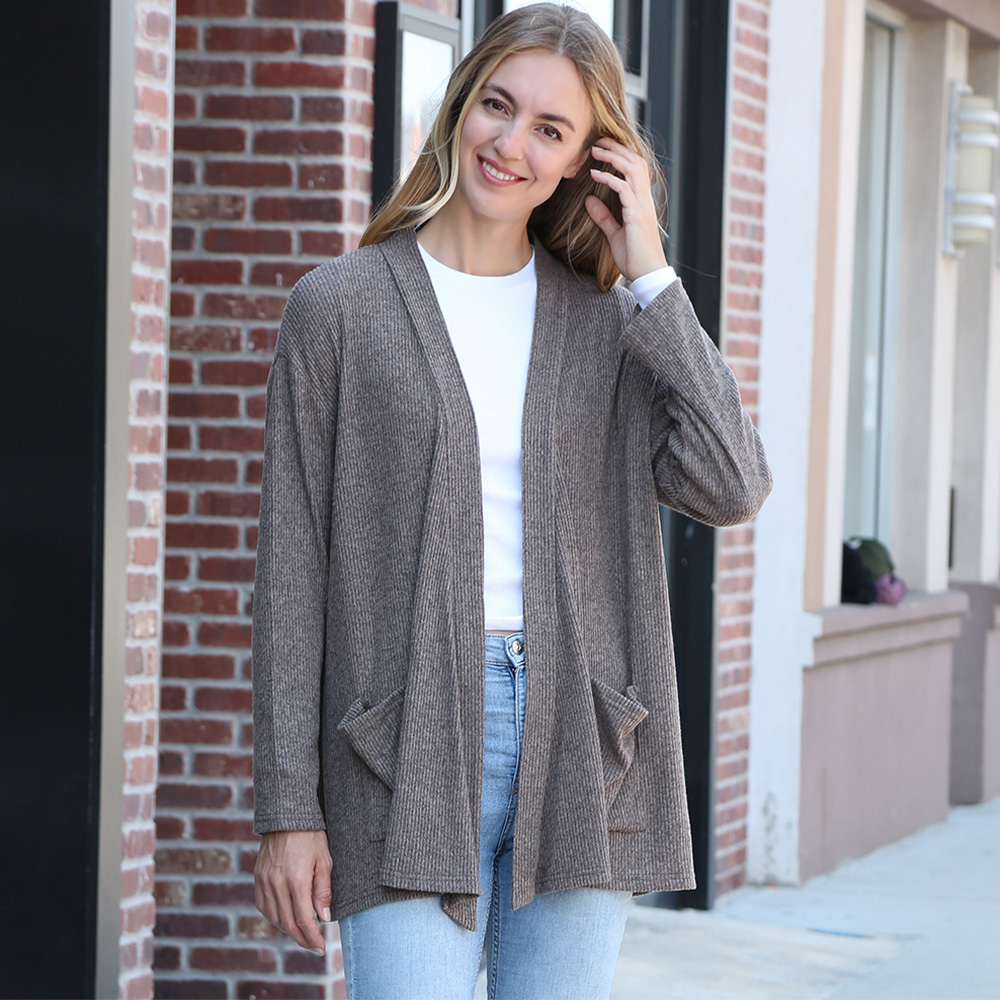 Solid Color Knit Ribbed Open Front Cardigan with Pockets