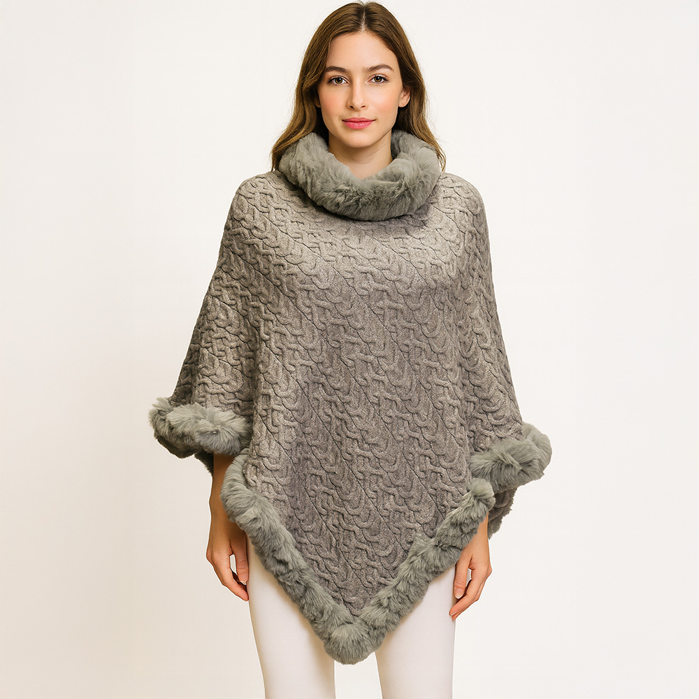 • Chic textured poncho with plush faux fur trim. Cozy and eye-catching style, perfect for chilly days and seasonal outings.