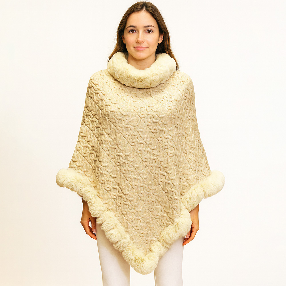 • Chic textured poncho with plush faux fur trim. Cozy and eye-catching style, perfect for chilly days and seasonal outings.