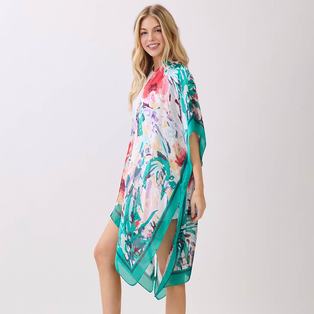 Abstract Floral Print Silky Feel Kimono Poncho