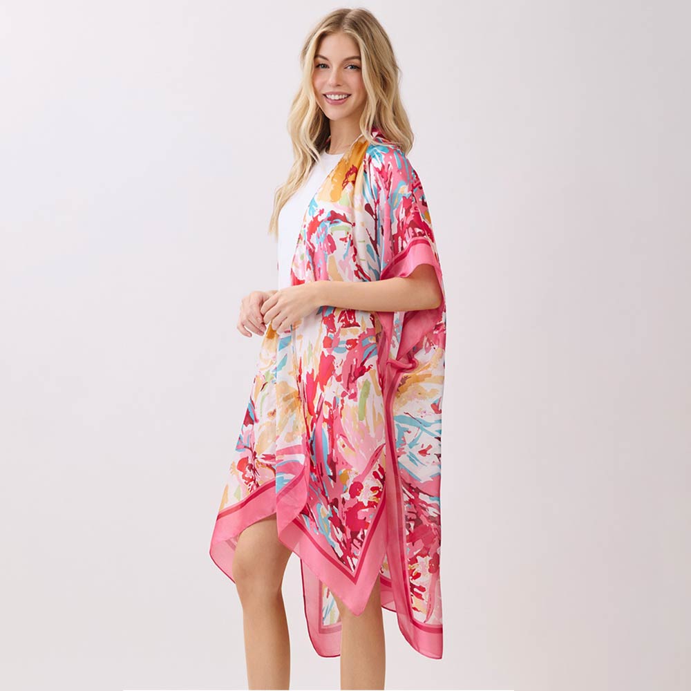 • This open front kimono poncho features an expressive abstract print with a fluid silhouette designed for easy layering. Ideal for boutiques seeking statement layering pieces, it elevates casual outfits, resort wear, and travel styling while offering a lightweight, relaxed fit that transitions effortlessly from day to evening.